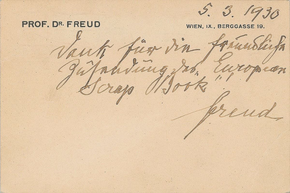 ANS in German, signed “Freud,” one page, 5.25 x 3.5, personal letterhead, March 5, 1930. Note on a “Prof. Dr. Freud” card featuring the address of his longtime residence in Vienna, “Berggasse 19,” now the site of the Sigmund Freud Museum. In full (translated): "I would like to thank you for your friendly sending of ‘European Scrap Book.’” In fine condition, with a crease to the lower right corner and old mounting tape on the reverse. Consignor notes that this was originally sent to Freud’s former student, the noted psychoanalyst Theodor Reik, who founded the National Psychological Association for Psychoanalysis.