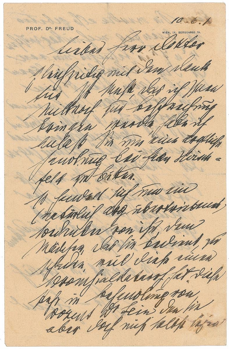 ALS in German, signed “Freud,” one page, 5.25 x 8.25, personal letterhead, June 10, 1912. Letter to a fellow doctor, in full (translated): "Simultaneously with my thanking you for your musical score that I shall be bringing with me to our meeting on Wednesday, I am requesting your presence for one to be remunerated co-consultation in the case of Mrs. Hirschfeld. I am dealing here with a (of course highly exaggerated) compulsion on her part of harming her servant girl because that girl is suffering of bronchial catarrh, which has been diagnosed by Prof. Dr. Fein, a diagnosis Mrs. Hirschfeld is rejecting. You are herewith kindly requested to arrive on Tuesday afternoon between 4:00 and 7:00 to visit the patient, letting her tell you her side. You can subsequently discuss with Dr. Fein the details of the case. In my professional opinion, there is no basis for her compulsion for aggression towards the girl. You are not likely to find Mrs. H. in a pleasant frame of mind. Her traumata are significant, her difficulties dealing with them are at least as considerable.” In fine condition, with writing showing through from opposing sides.