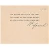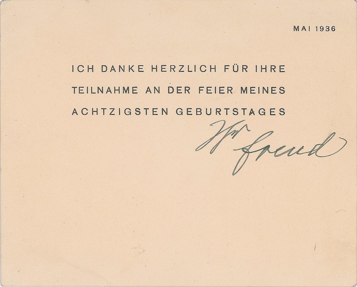 Sought-after fountain pen signature, "Ihr, Freud,” on an off-white 6 x 4.75 appreciation card bearing preprinted German text (translated), "Thank you very much for your participation in the celebration of my 80th birthday." Dated May 1936 in the upper right. In fine condition. Pre-certified PSA/DNA.