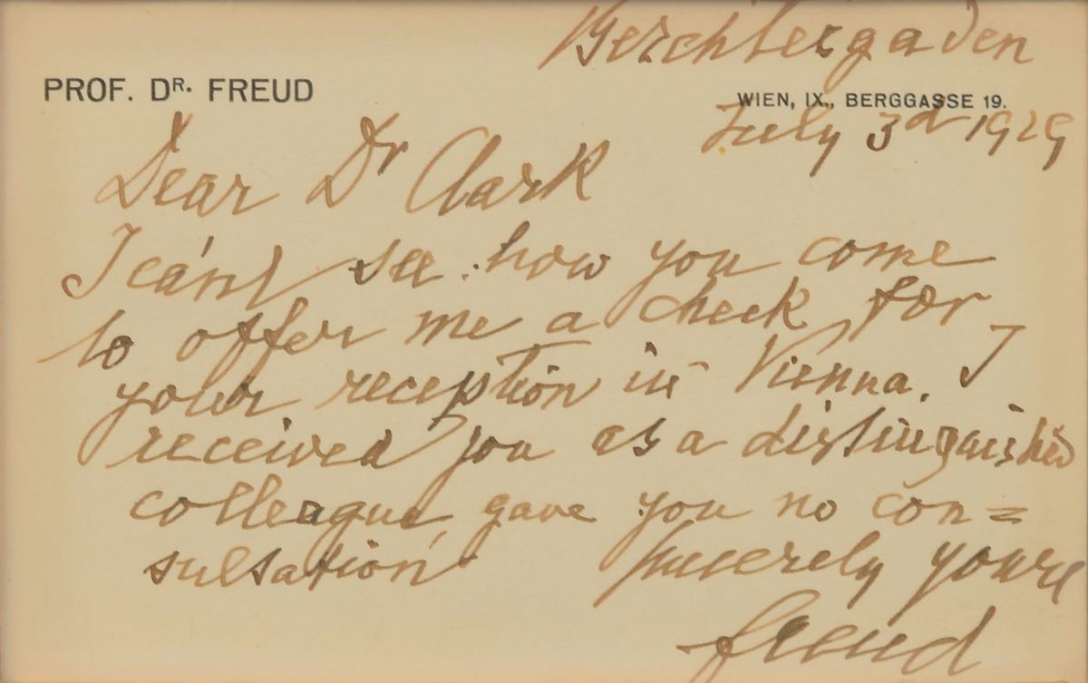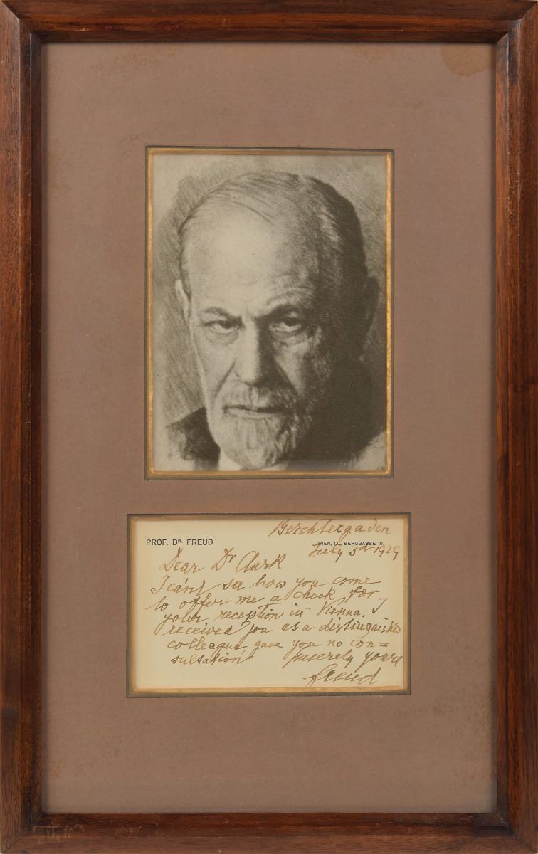 ALS signed “Freud,” one page, 5 x 3.25, personal letterhead, July 3, 1929. Letter to "Dr. Clark," in full: "I can't see how you come to offer me a check for your reception in Vienna. I received you as a distinguished colleague, gave you no consultation." Double-matted and framed with a portrait to an overall size of 10 x 16. In fine condition.
