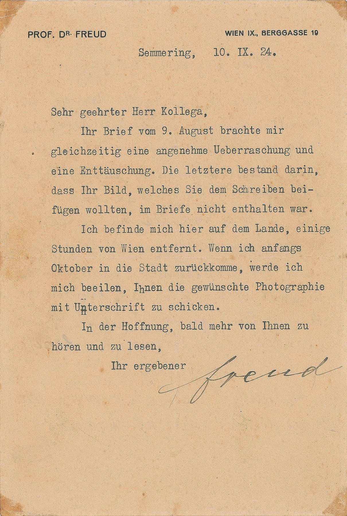 TLS in German, signed “Freud,” one page, 6 x 8.75, personal letterhead, September 10, 1924. Letter to a "Dear Colleague," in part (translated): “Your letter of August 9th brought me a pleasant surprise and a disappointment. The latter was that your picture, which you wanted to add to the letter, was not included. I am here in the country, a few hours from Vienna. When I return to the city at the beginning of October…I will hurry to send you the signed photograph…Hoping to hear and read more from you soon.” In very good condition, with moderate creasing, light soiling, and old tape residue at the corners.
