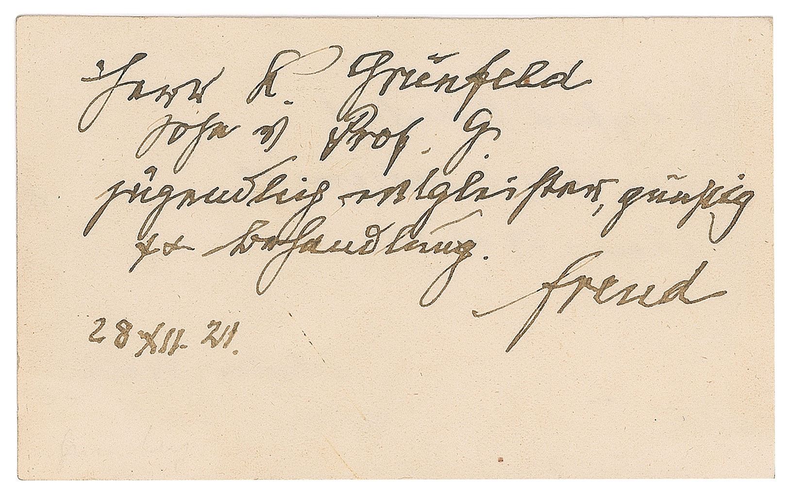 Untranslated ANS in German, signed “Freud,” one page, 4.5 x 2.75, December 28, 1924. Reverse features the address of Dr. Siegfried Bernfeld, which reads, "Dieu, XIII/9 Suppegarse 10," along with his phone number. In fine condition. Bernfeld was a fellow Austrian psychologist who published an article in Freud's journal in 1931.