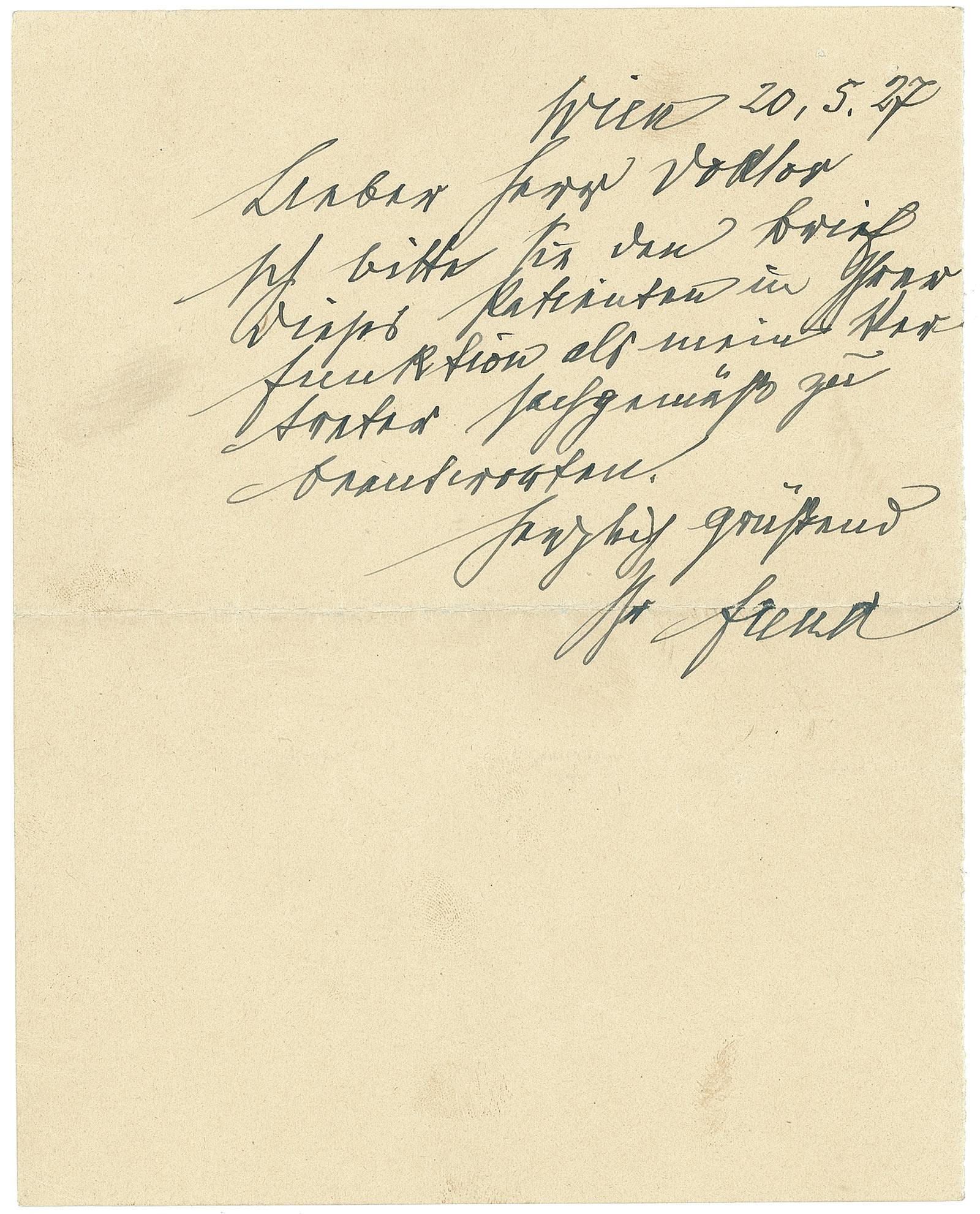 ALS, one page, 6.25 x 7.75, May 20, 1927. Letter, in German, to Doctor Paul Federn. In full: “I am asking you to answer this letter of my client properly in your capacity as my representative.” In fine condition, with a central horizontal mailing fold through top portion of signature, tiny staple holes to top right, and some scattered toning and light soiling.