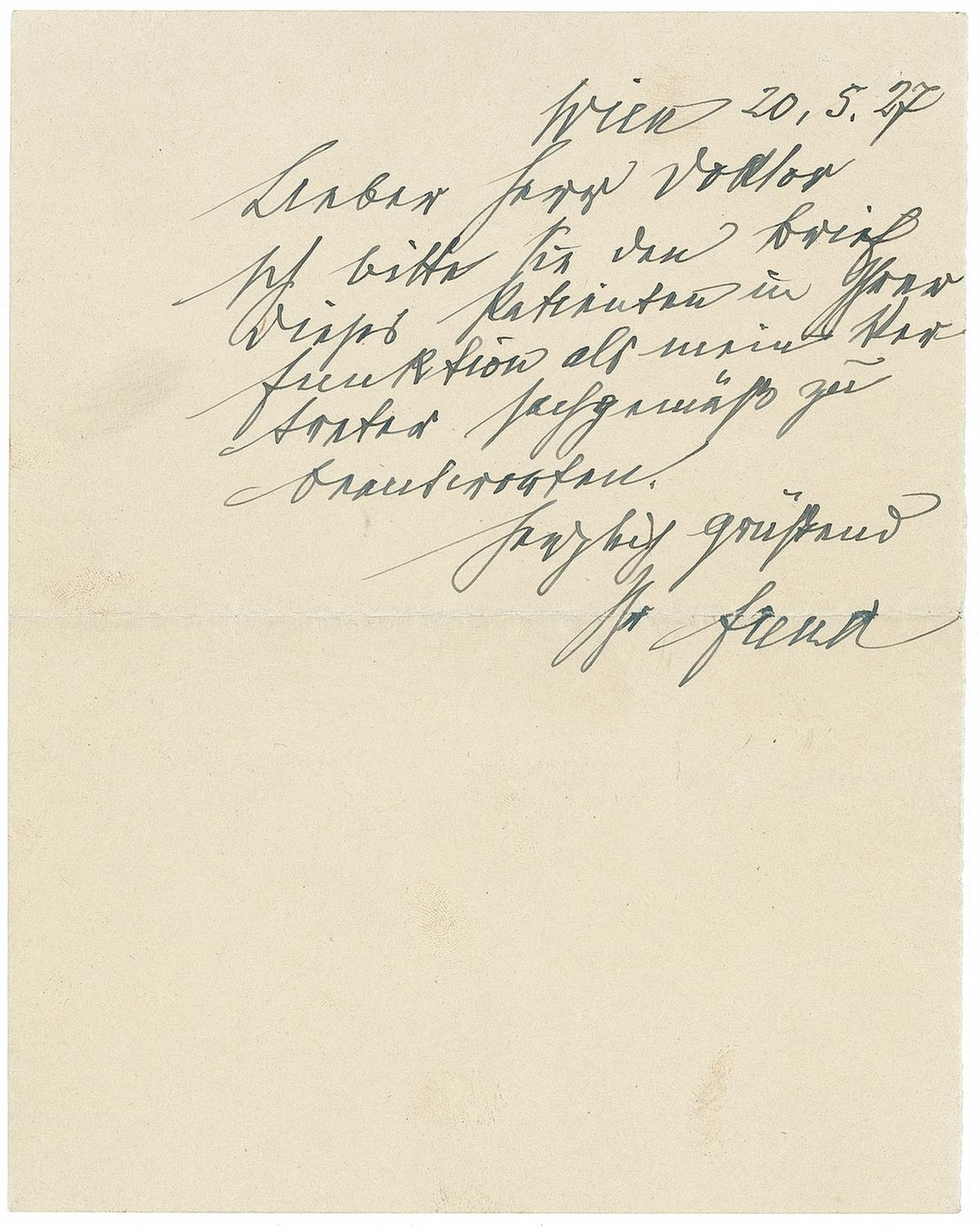 ALS, one page, 6.25 x 7.75, May 20, 1927. Letter, in German, to Doctor Paul Federn. In full (translated): “I am asking you to answer this letter of my client properly in your capacity as my representative.” In fine condition, with a central horizontal mailing fold through top portion of signature, tiny staple holes to top right, and some scattered toning and light soiling. When Freud fell ill with cancer of the jaw in 1923, he appointed Federn—an Austrian American psychologist whose relationship with Freud spanned 35 years—as personal deputy in all his professional affairs. Thus, it was in that “capacity as my representative” that he issued this directive. Interestingly, Freud was among the many Europeans of the era who could not readily adjust to use of the telephone, and relied on letters such as this to correspond with Federn. A pioneer in the field of mental health and the application of psychoanalysis to social problems, Federn strove to transform psychoanalysis into an instrument for social and political change. Brief but interesting content from Freud’s personal life.