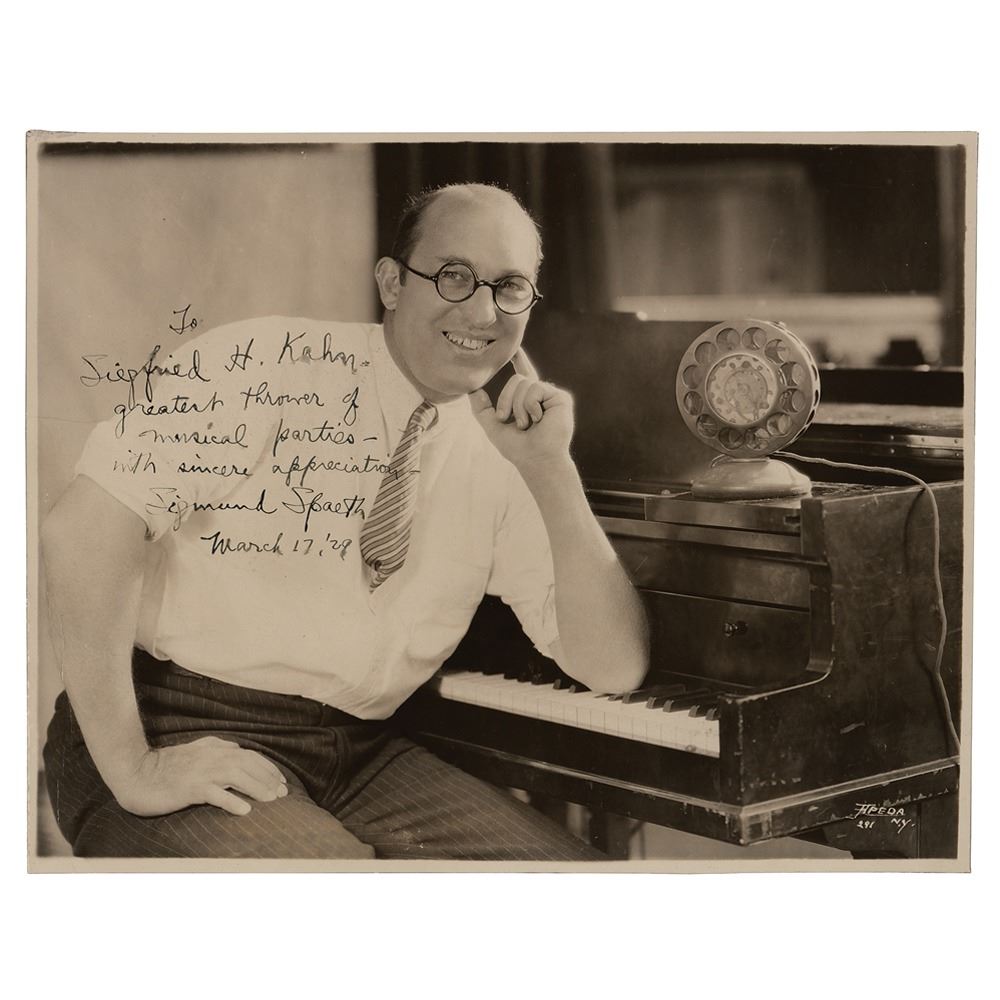 American musicologist and educator known as 'The Tune Detective' (1885–1965) who traced the sources and origins of popular songs to their folk and classical roots. Vintage glossy 9.75 x 7.5 photo of Spaeth with a piano, signed and inscribed in fountain pen, "To Sigfried H. Kahn, greatest thrower of musical parties—with sincere appreciation—Sigmund Spaeth, March 17, '29.” Affixed to a same-size mount and in fine condition, with evenly trimmed edges.