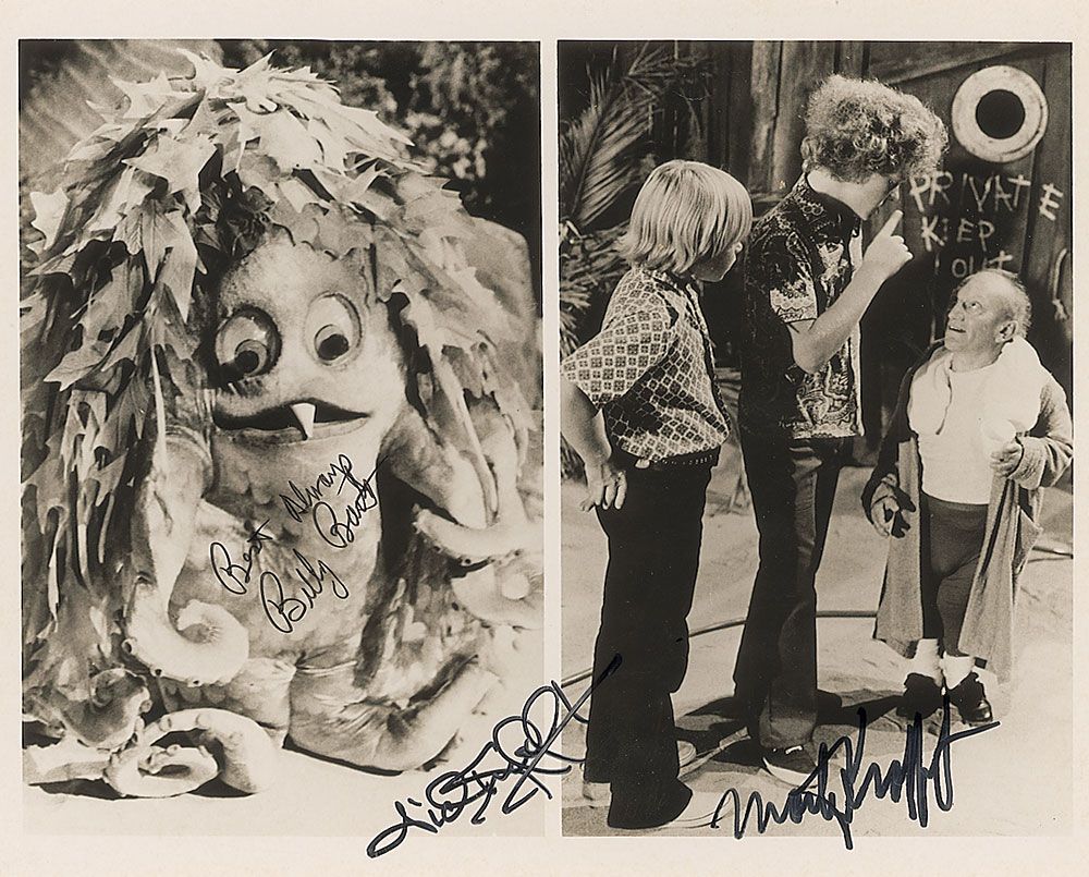 Glossy 9 x 7 NBC Television composite publicity photo, signed in black felt tip by Billy Barty, and Sid and Marty Kroft. Promotional information is affixed to the reverse. In fine condition.