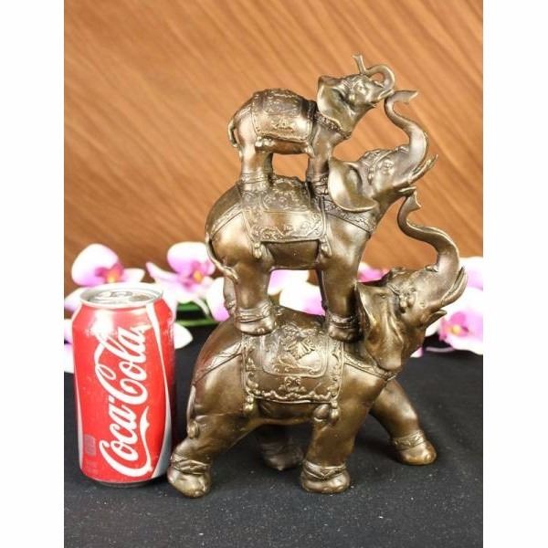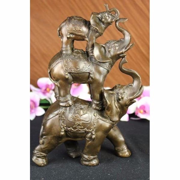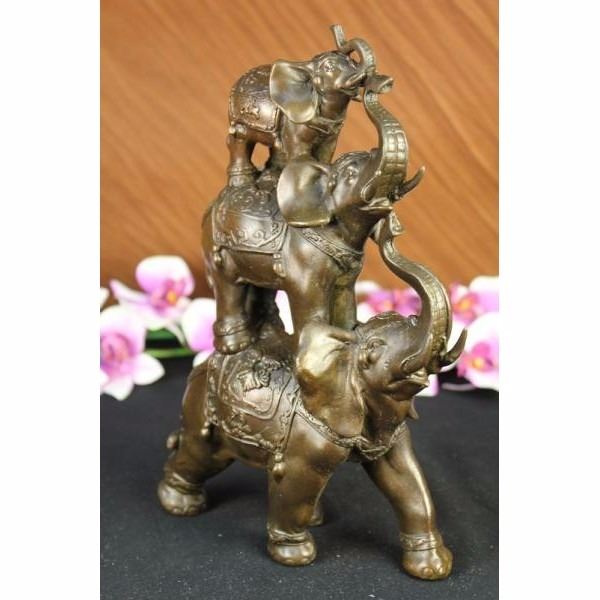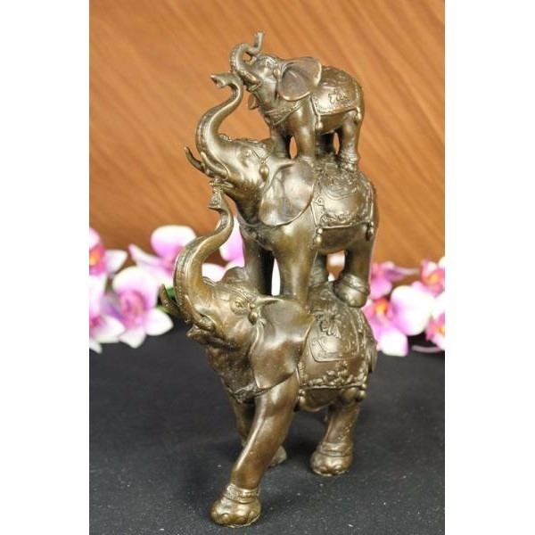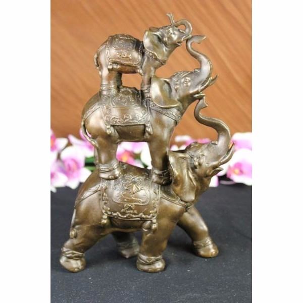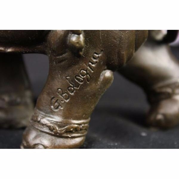 The bronze sculpture in its abstract composition shows three elephants ascending in size from largest to smallest with upturn trunks. They each wear a saddle that boast exquisite details with an Art Deco flair. For years the elephant has been known as a sacred animal in the East. As the largest animal to walk the Earth, the elephant is known as a symbol of strength and power. It also represents perseverance, in that it is an extremely hard working animal. Elephants are also seen as symbols of wisdom and dignity, because of their incredible intelligence and very long life span. It is believed that an elephants trunk being raised up is a symbol of good luck, fortune, and optimism. The elephants were cast using the ancient methods of lost-wax casting and stained with brown patina finish for preservation. They are mounted upon a black variegated marble base with the artist G. Bologna's signature. Condition: This sculpture is in perfect condition. Bronze Dimensions :Height 11" x Width 7" Weight : 8 LBS Inventory 69-X10444296