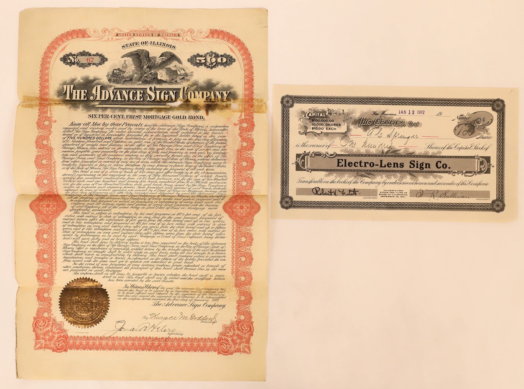 Issued 1912 Electro Lens Sign stock. Bond-1898 Advance Sign in poor condition, please inspect.