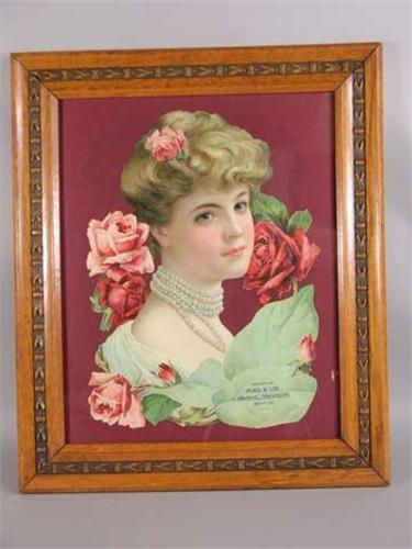 Die cut, embossed sign for Ford & Lee, General Merchants, Quincy, CA. 11.5" x 16". Some tears and wrinkles.