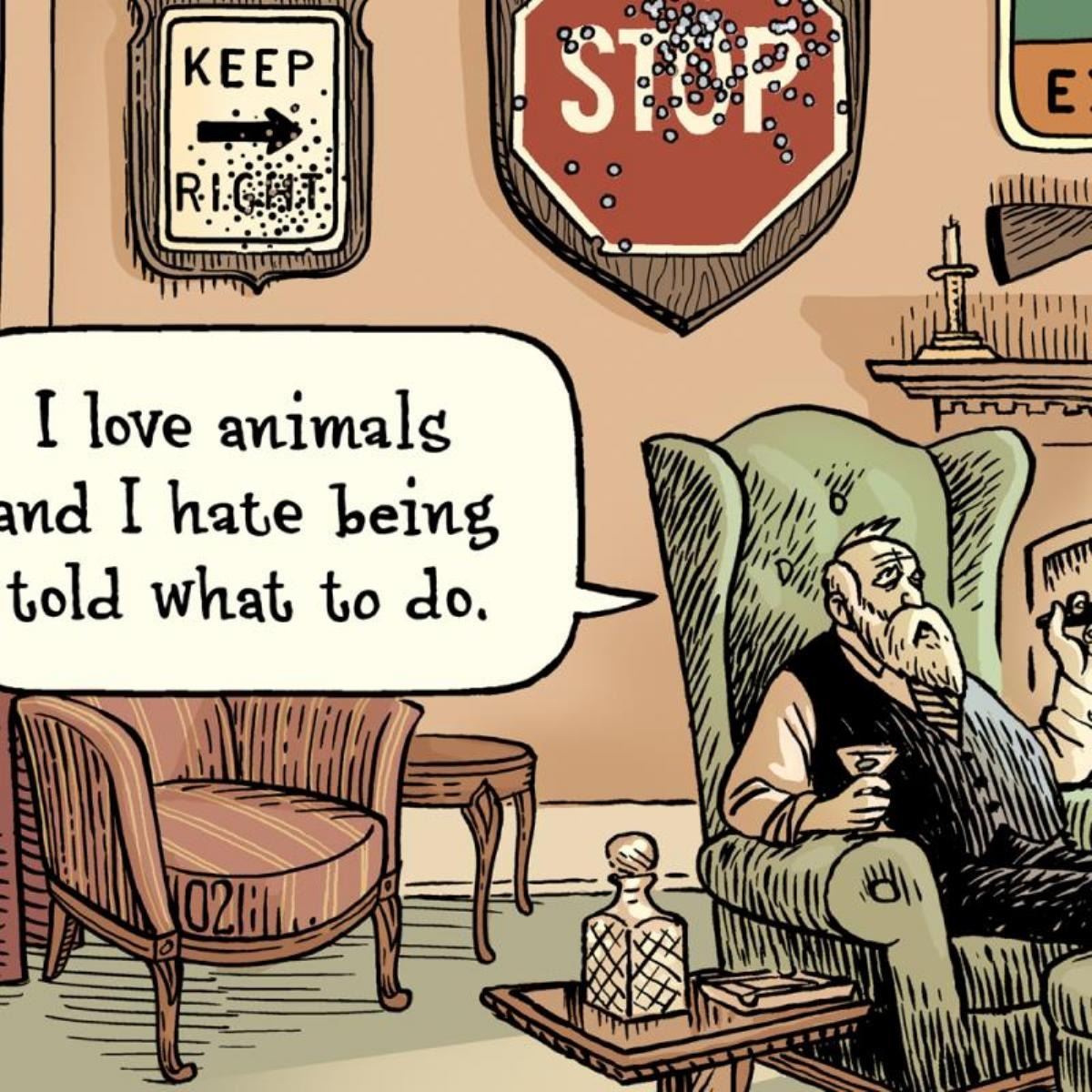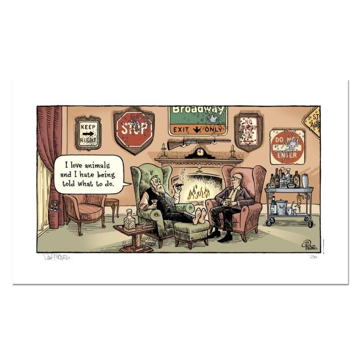 Sign Hunter by Bizarro. "Sign Hunter" is a limited edition giclee on paper by Dan Piraro, creator of the critically acclaimed and award winning comic strip, Bizarro! This piece is numbered and hand signed by the artist and includes aletterof authenticity. Measures approximtely 8" x 15" (image).