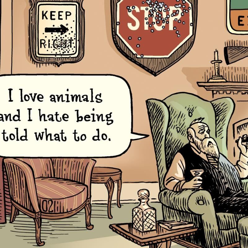 "Sign Hunter" is a limited edition giclee on paper by Dan Piraro, creator of the critically acclaimed and award winning comic strip, Bizarro! This piece is numbered and hand signed by the artist and includes aletterof authenticity. Measures approximtely 8" x 15" (image).