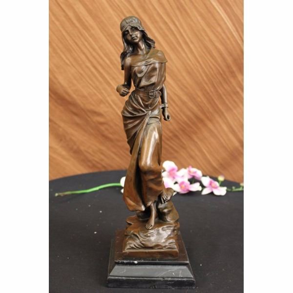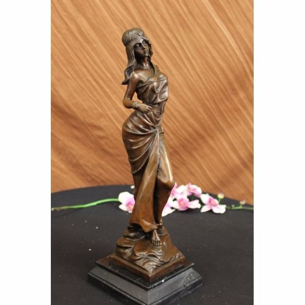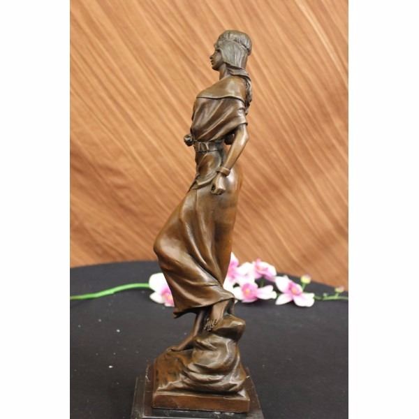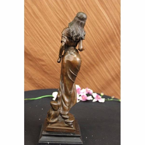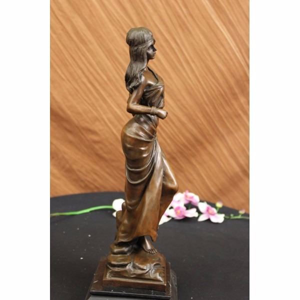 She is the most sought after girl. As she walks, all eyes follow. She is the source of all the men's desire and the source of all the women's envy. Her confidence radiates, as she struts unaware of the attention she is commanding. She wears a careless dress that appears to have just been thrown on without much thought but it fits her perfectly. It hangs off her shoulder and drapes over her curves. A belt rests high on her waistline. She wears a cuff around her delicate wrist. A headband crowns her head, as her feathery hair frames her face. 100% bronze and handmade, this brown patina sculpture was cast using the "Lost Wax Method" and mounted on a marble base and is signed C. Mirval. Condition : This sculpture is in a perfect condition. Bronze Dimensions with Marble Base:Height 17" x Width 6" Marble Dimensions: 6" X 6". Height without base: 15" Weight : 12 LBS Inventory:30DS1614203