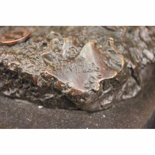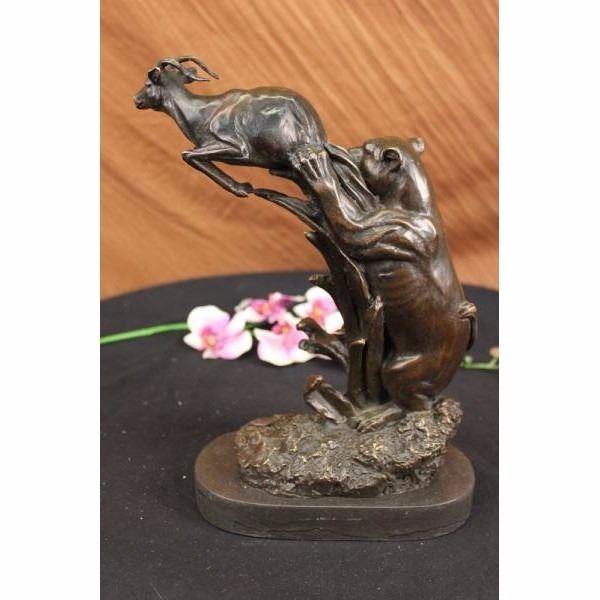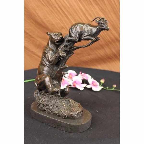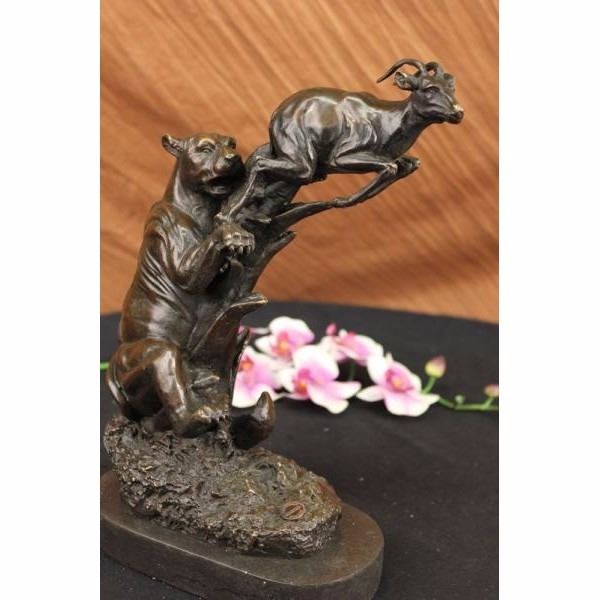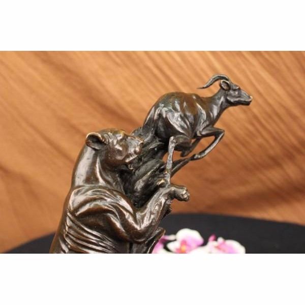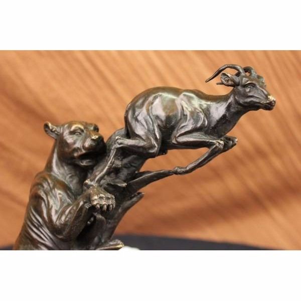 This jaguar was lurking in the shadows of his play field and spotted his meal of the day. The baby deer starts to run for his life, but knows their is no hope for him, he is the jaguar's dinner already. He tries to climb up a tree to hop over but the jaguar is to quick for is little legs. The jaguar takes a big bite off the little deers leg, holding on real tight making sure he wont lose grip. He starts to feast, not even caring that the poor deer is still alive and will feel everything. This sculpture was cast using the ancient old "Lost Wax Method" stained in brown patina finish for preservation. 100% handmade and 100% bronze, mounted atop a black marble base and is signed by artist Barye. Condition: This sculpture is in perfect condition. Bronze Dimensions with Marble Base:Height 13" x Width 12" Marble Dimensions: Diameter 8" Height without base: 12" Weight : 12 LBS Inventory : 17Y6723641