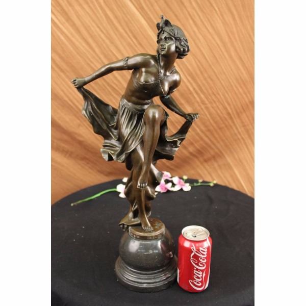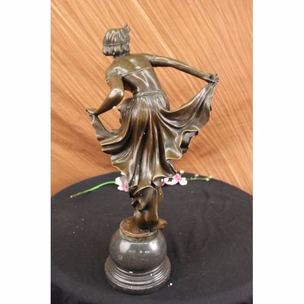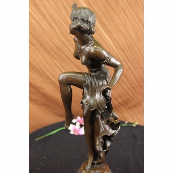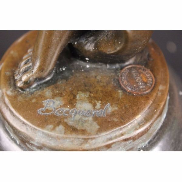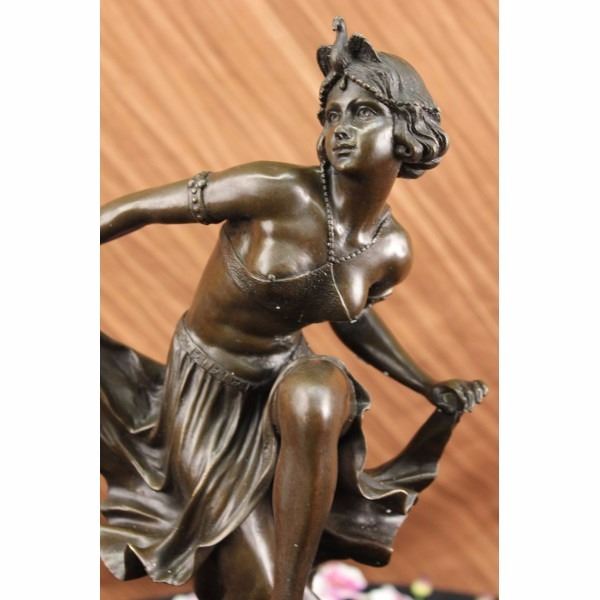 As our wild flapper dances wildly she smiles and lifts her skirt up high as she dances the night away. She bends forward and lifts her leg as her small hard nipples poke out from her top. Her top is made a material with a textured surface and is barely being held up by a beaded neck tie. She is barefoot and carefree of her exposure. Her short hair is held back by an interesting head piece in the shape of a bird with a bead dangling from the middle and beads wrapping around her head. She has arm bands with studded accents and her skirt is held in place by a belt with a floral imprint. As she lifts her leg up high she pulls her skirt out to the side creating a gorgeous caption of still flowing motion. The sculpture was casted using the Lost Wax Method and has a brown patina . The statue is signed Becqrrel- Condition : This sculpture is in very good condition. Bronze Dimensions with Marble Base:Height 20 1/2" x Width 9 1/2" Marble Dimensions: Diameter 6". Height without base: 16" Weight : 22 LBS Inventory : 2697B2 1962