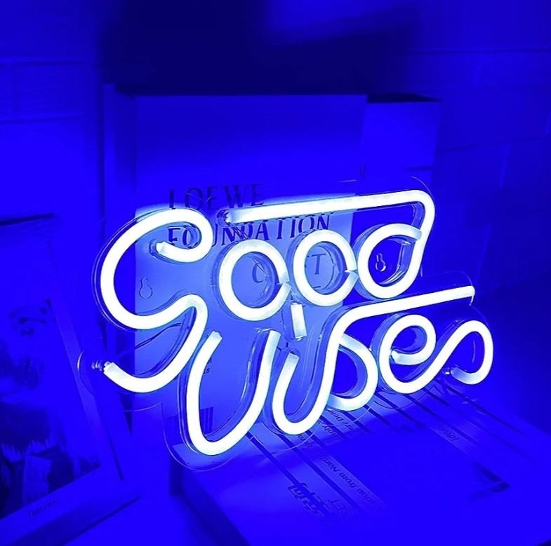 Neon Sign, Good Vibes, Color Blue, Battery/USB Power Capabilities, Color White Neon, Shelf Pull, New Condition