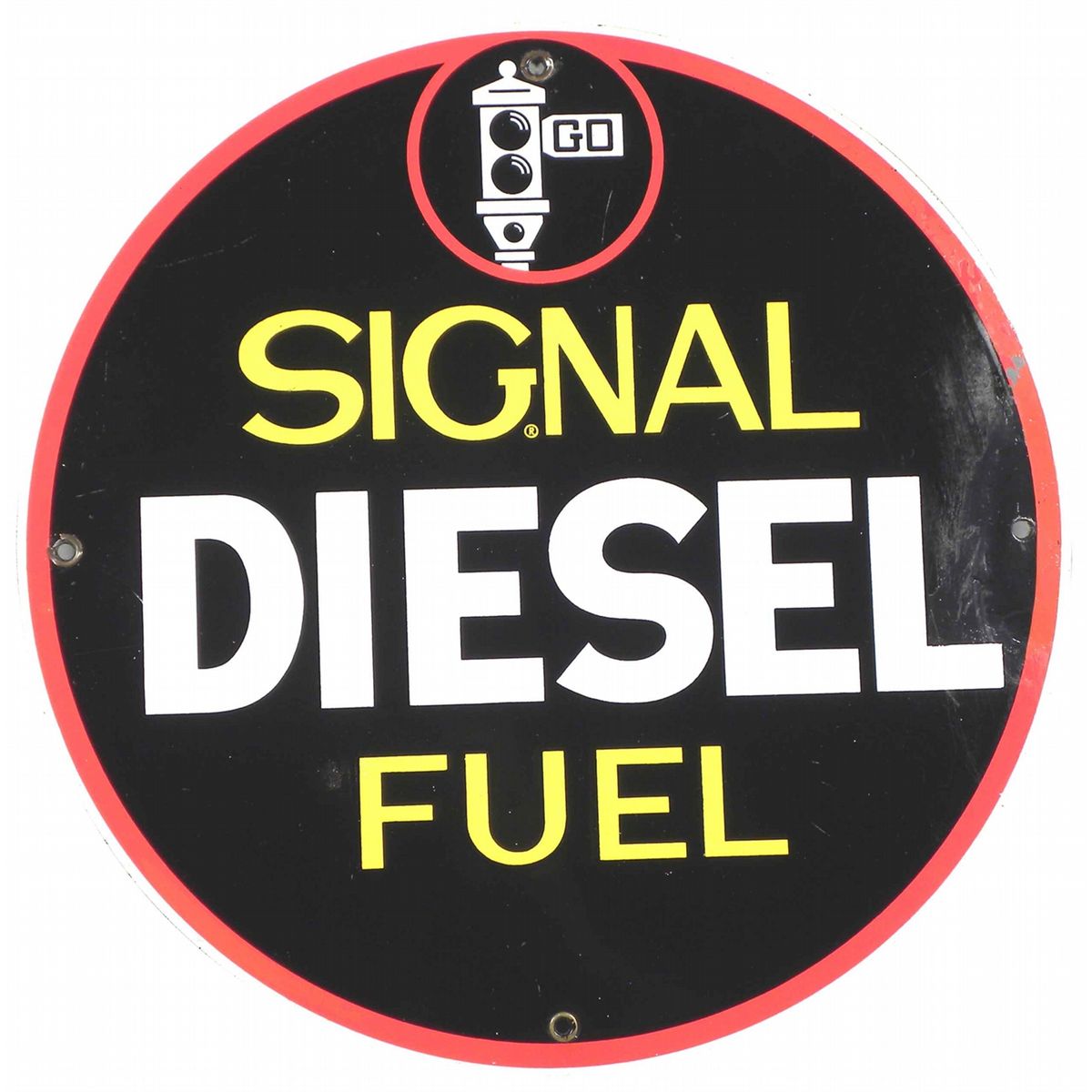 Signal Diesel Fuel Porcelain Sign. Minor paint loss at 2:00 otherwise near mint condition. 12 inch diameter.