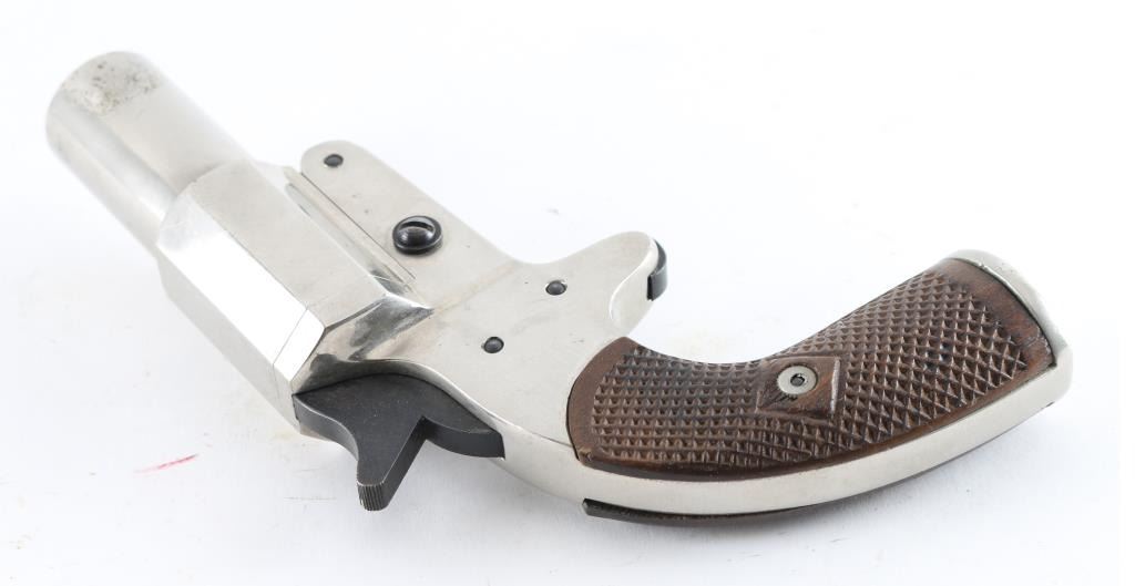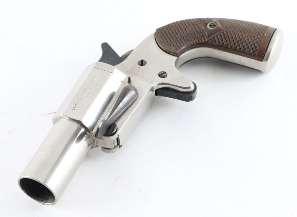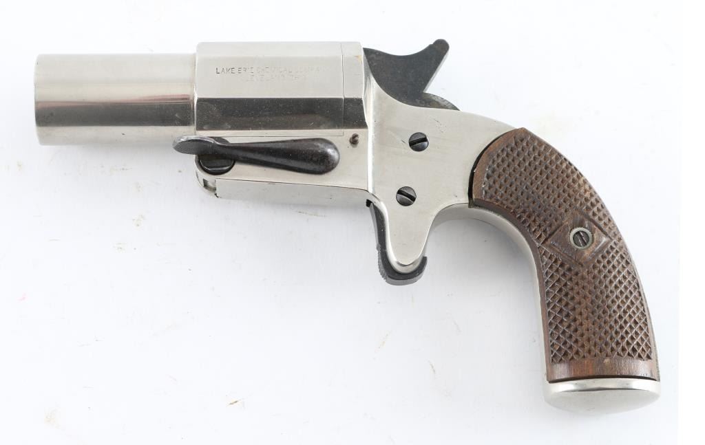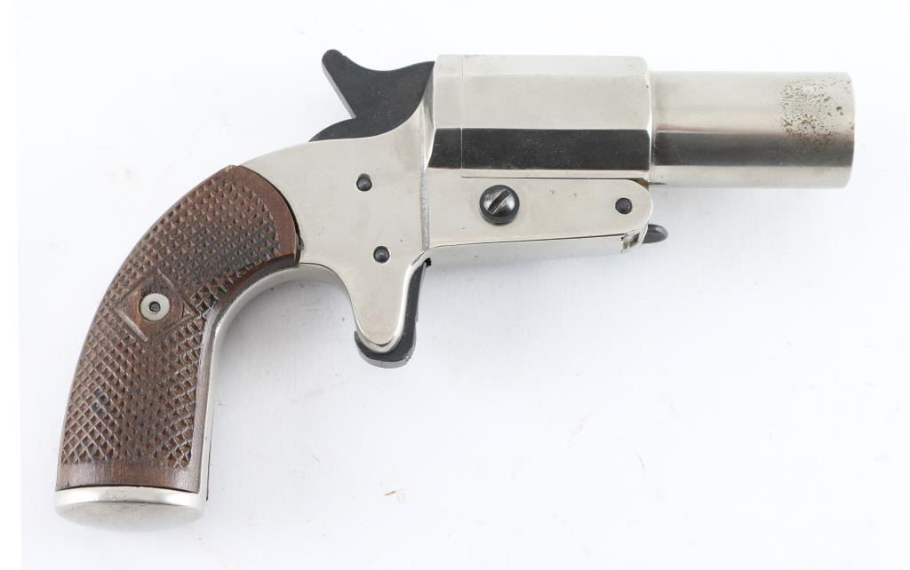 Signal flare pistol from Lake Erie. SN - #1842, 26.5mm with a 4" barrel, "Very" design used during WWI, but produced during the 1930s, nickel plated cast brass with wooden grip scales, serrated spur trigger and hammer. "42" marked on grip frame under left wood panel, "Flaming Bomb" marks on the breech face of the frame, and on the end of the barrel by the latch. Condition is Excellent.