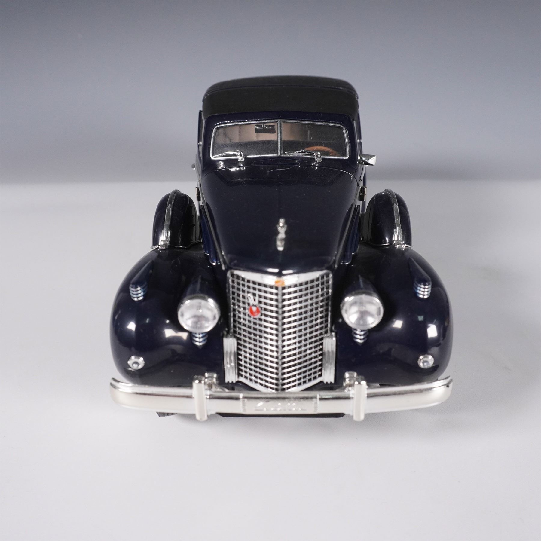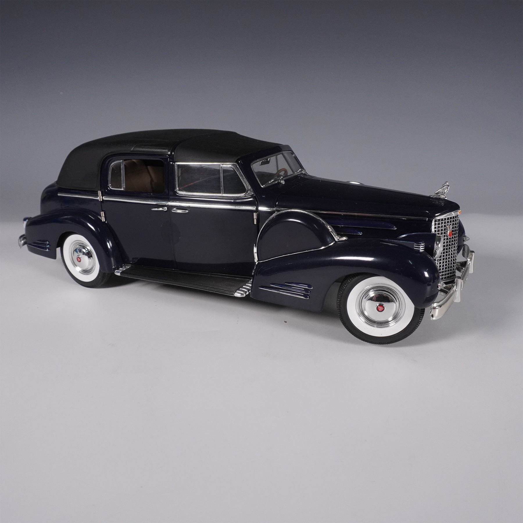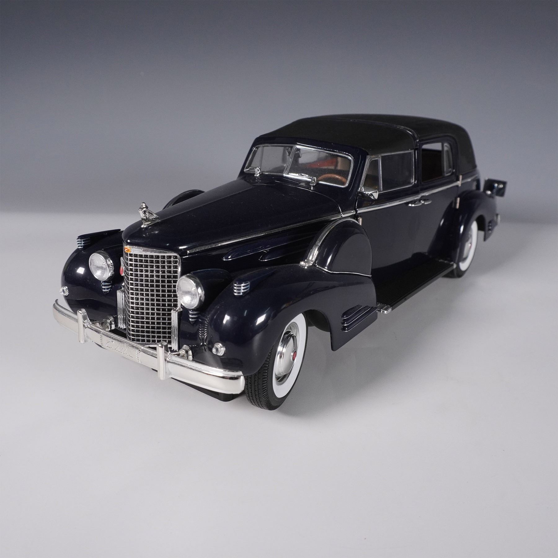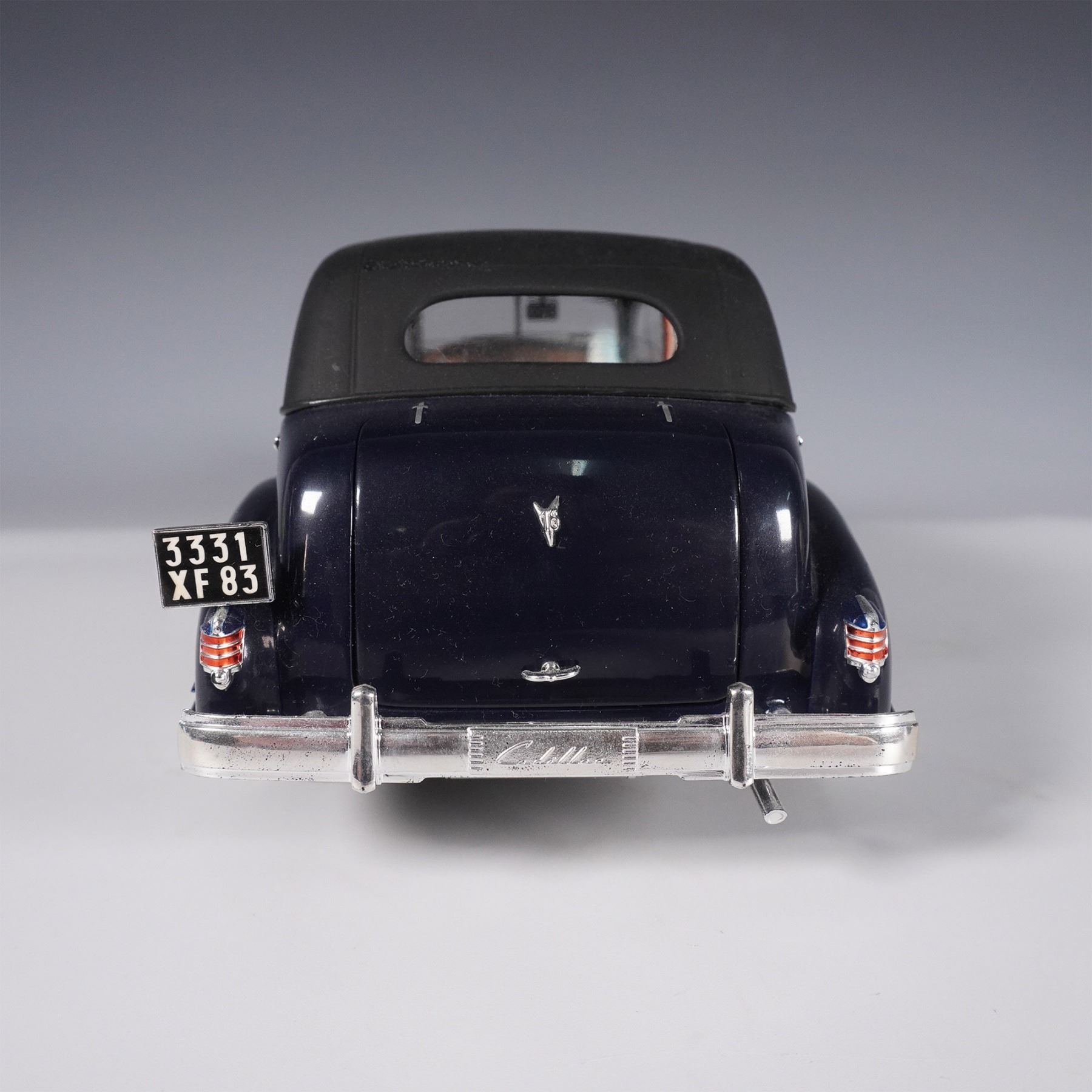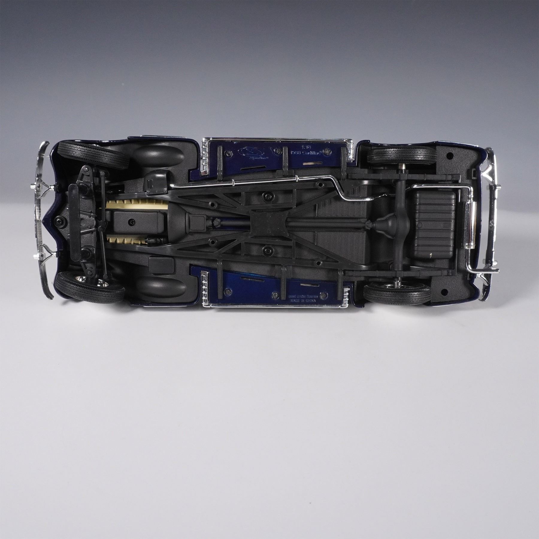 This highly detailed 1:18 scale model of a 1938 Cadillac convertible is made by Signature, known for its fine craftsmanship in creating collectible car models. The model features a rich blue body with chrome detailing, white-wall tires, and realistic front and rear bumpers. The meticulously designed interior showcases a vintage dashboard, detailed upholstery, and fine attention to detail. The underside is stamped with factory markings, confirming its authenticity. This model is an excellent representation of the elegance and luxury associated with Cadillac in 1938 and is an exceptional piece for automobile enthusiasts and collectors of high-quality scale models.
