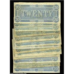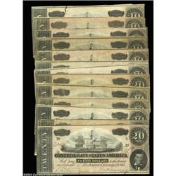 Signature Collection of T67s. A wonderful group for the specialized collector, with 13 1864 $20s, each bearing different signature combinations for the Register and Treasurer. Grades range from Fine to Extremely Fine, and all thirteen notes are problem-free circulated examples. 13 notes Important notice: Heritage usually auctions material at the rate of 200-250 lots per hour. On some occasions eBay Live bid software or the Internet may not be able to keep up with the pace of the auction. We recommend placing a realistic absentee bid now as insurance to avoid disappointment. Occasionally the auctioneer may eliminate or reject an eBay Live bid, and the auctioneer may also reopen a lot after the close of the eBay live bidding (usually because we missed an audience bid), and may reject your bid even if it shows you as the winning bidder. By bidding via eBay Live, you agree that Heritage may award the lot to another bidder at its sole discretion under the circumstances described above or any other reasonable circumstances. Also please note that all Heritage lots purchased through eBay Live carry a 20% Buyer's Premium. Please make sure you read the Terms and Conditions before you bid.
