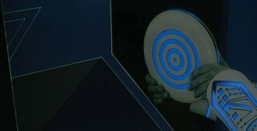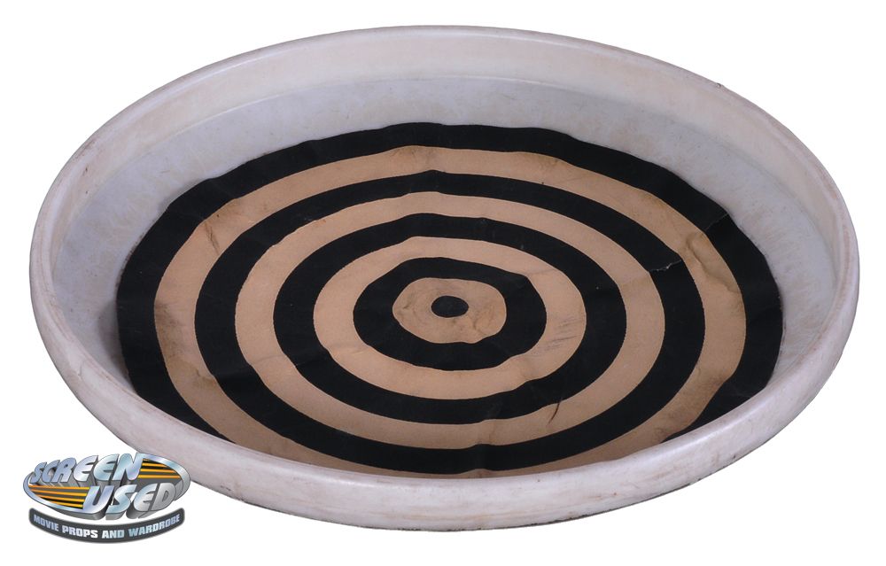 (Disney, 1982) Perhaps the most identifiable prop from this imaginative film, is this Identity Disc, a detachable glowing disc worn on the user’s back. As the villain, Sark, so eloquently put it, “You will each receive an identity disc. Everything you do or learn will be imprinted on this disc. If you lose your disc, or fail to follow commands, you will be subject to immediate deresolution. That will be all.” Based on a Frisbee, the disc is constructed of white plastic with applied black gaffer tape at the outside edge and white and black painted paper affixed at the center and inside surfaces. Measures 9 ¼ in. diameter. Exhibits minor soiling but remains in very good condition.