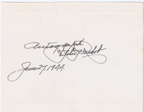 JOHN J. RASKOB. S. 1pp. 4" x 3". New York. June 27, 1944. A card signed "Autograph John J Raskob June 27, 1944." It is accompanied by the original envelope and in excellent condition.