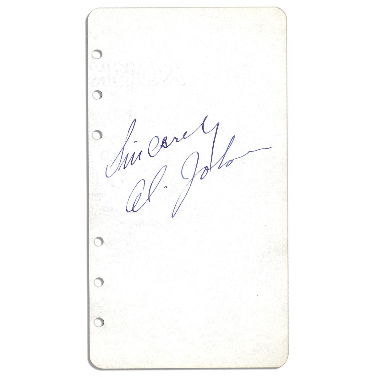 Al Jolson's signature. Hailed as the World's Greatest Entertainer during the 1930's, the singer and star of the first feature-length talkie inscribes: ''Sincerely / Al Jolson'' in blue ink to a plain sheet. Jolson's versatility as a performer encompassed the realms of music, comedy, stage and film. His pioneering style and implementation of his personal charisma singing jazz and blues is said to have paved the way for the phenomenon of rock-stardom. Imperceptible type to verso, else near fine. Measures 3.75'' x 6.75''.