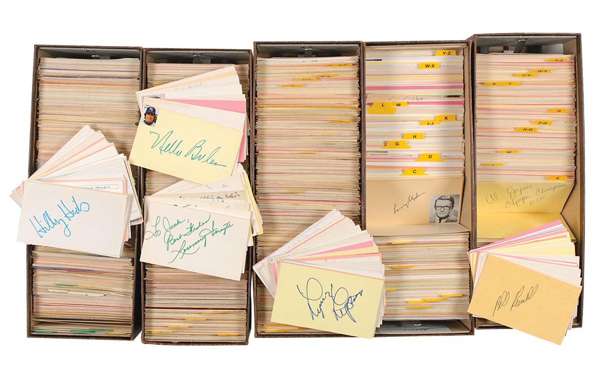 Massive collection of approximately 5,300 signatures on 5 x 3 cards, each signed by an ‘entertainer’ from a variety of different fields—most are actors or actresses, but also included are a significant number of signatures from opera singers, athletes, musicians, and a smattering of other notables. Signers include: Lou Albano, Earl Averill, Dave Bancroft, Christiaan Barnard, Jerry ‘Crusher’ Blackwell, Freddie Blassie, Ralph Branca, The Brothers Johnson, John Cassavetes, Orlando Cepeda, Joe Collins, Betty Comden and Adolph Green, Alice Cooper, Quentin Crisp, Rodney Dangerfield, Sandy Dennis, Larry Doby, Bobby Doerr, Donovan, Jimmie Dykes, The Four Tops, Peter Frampton, Freddie Garrity, William Gillette, Joe Gordon, Debbie Harry, June Haver, June Havoc, Billy Herman, Hildegarde, Magnus Hirschfeld, Lou Holtz, DeWolfe Hopper, Sarah T. Hughes, Charlie Joiner, George L. Kelly, Tug McGraw, Anita Morris, Patricia Neal, LeRoy Neiman, Edmond O’Brien, Lefty O’Doul, Maureen O’Hara, Marie Osmond, Robert Pastorelli, Randy Quaid, Hugh Reilly, Cliff Richard, Slapsie Maxie Rosenbloom, Robert Ryan, Gleen S. Seaborg, Sebastian Shaw, William Shockley, Karl Spooner, Isaac Stern, Gloria Swanson, Ray Teal, Robin Trower, Bill Veeck, Eli Wallach, Dennis Weaver, Betty White, Jonathan Winters, Bill Withers, and Jane Wyatt. In overall fine condition. An impressively large and extensive instant autograph collection.