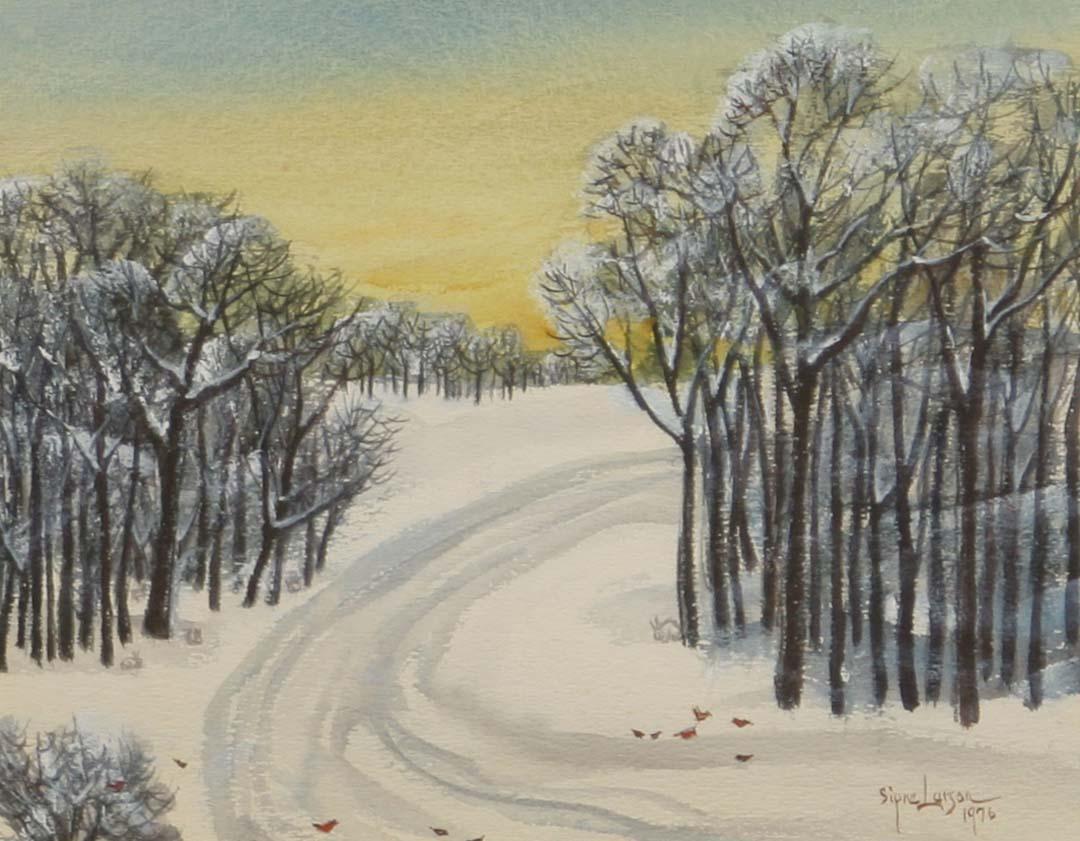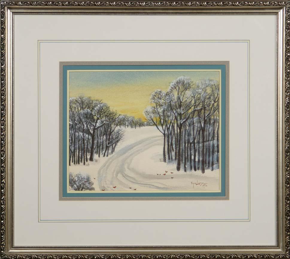 Signe Larsen (20th-21st Century). Winding Road In Winter, 1976. 9 ¼" x 11 ¾" watercolor. Signed lower right. Larsen was a student of Birger Sandzén's and a Bethany College graduate. (est $600-800). For condition reports please visit: www.auctioninsantafe.com/cr2011.pdf