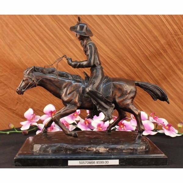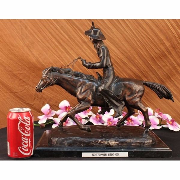 A seasoned cowboy is casually patrolling the area, when suddenly something catches his attention. He yanks on the reins and his loyal horse charges forward. They gallop through the open dryplains as he shoots his pistol in the air.He is dressed in a shirt,chaps and boots, giving him the look of a good ole fashioned sheriff. A long rifle is slung to his side. 100% bronze and handmade, this two-toned brown patina sculpture was cast using the "Lost Wax Method" and mounted on a black marble base. It features the signature Frederic Remington. Condition: This sculpture is in a perfect condition. Bronze Dimensions with Marble Base:Height 14" x Width 16" Marble Dimensions: 14" X 8". Height without base: 13" Weight : 22 LBS Inventory:31-50570M8931