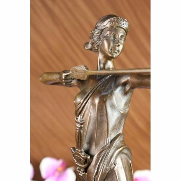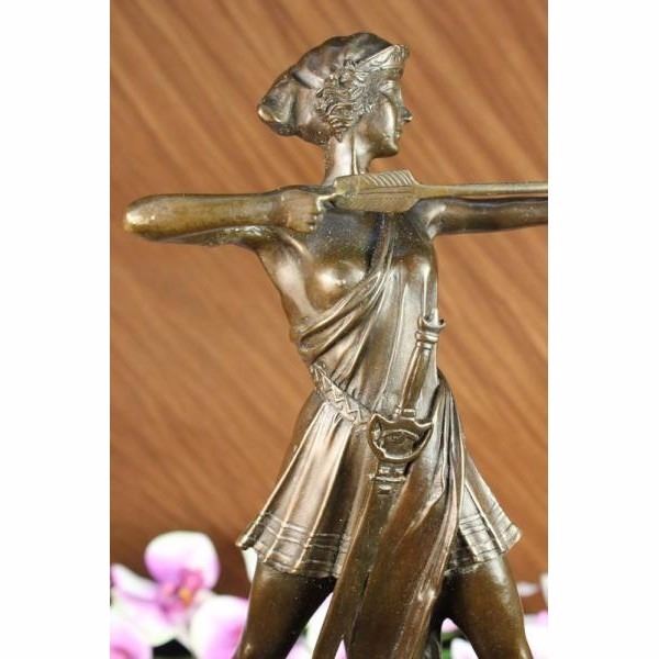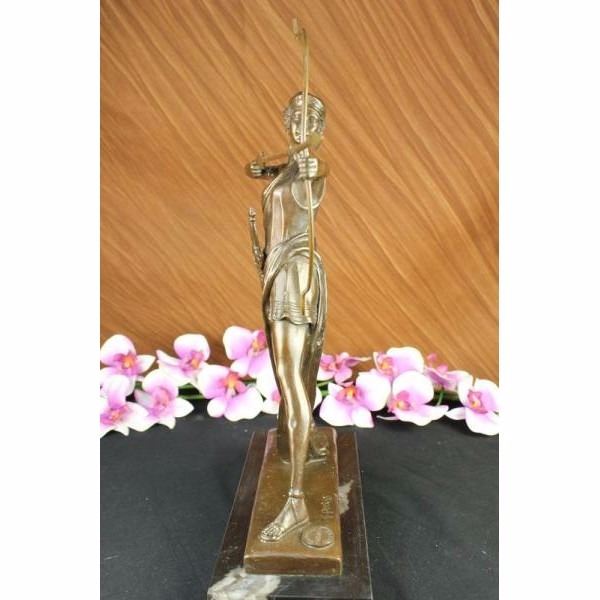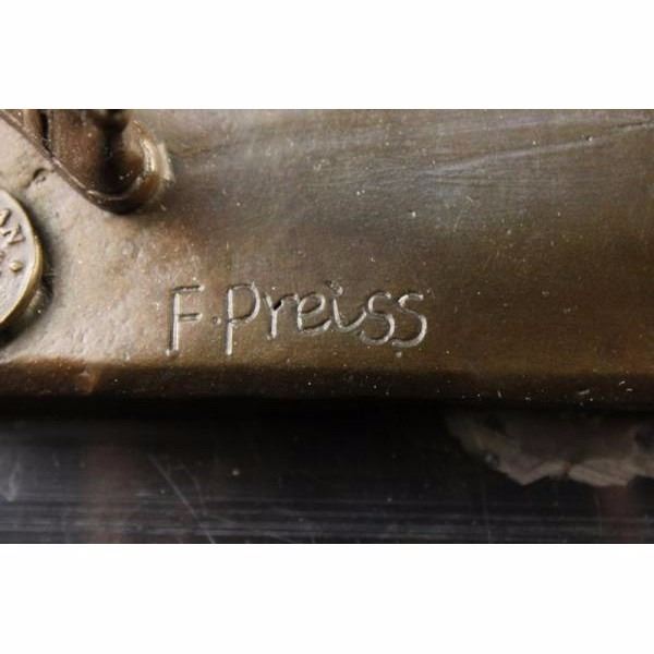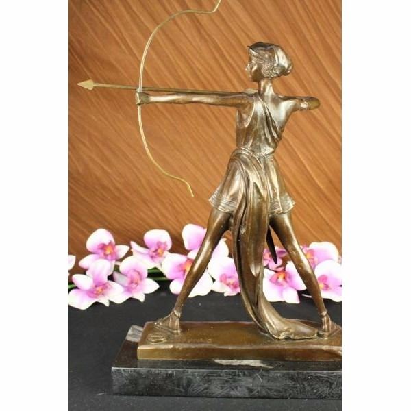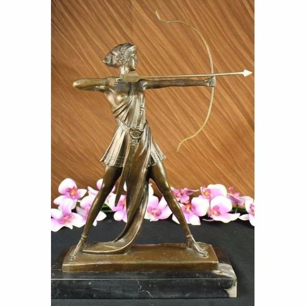 "Diana the Hunter", also known as "Diana Nemorensis" and "Artemis". She was worshiped by many as the goddess of hunt, animals, woodland and the moon. In Capua and in Aricia, localities near Rome, there are still shrines dedicated to her. Her shrine in Aricia was on the shores of them lake Nemi. For that reason, she was named Diana Nemorensis-Diana of the Woods. This sculpture depicts the beloved goddess with her iconic crossbow, as she draws back on the string. She holds her perfect hunter's form. Her legs are firmly locked and her body forms a line as she locks her eyes on her target. Throughout time Diana has become a popular feminist figure because of her beauty, strength, and chastity. 100% handmade bronze, this brown patina sculpture was cast using the "Lost Wax Method" and mounted on a black marble base and is signed by the artist F.Preiss. Ferdinand Preiss was born on the 13th February 1882 in Erbach in the Odenwald. Ferdinand lived with the family of the then famous carver Philipp Willmann, where he was trained to be a carver. In 1901 he left Willmann's workshop and travelled to Mailand, Rome and Paris. He earned his living as a modeler. Ferdinand Preiss died that year at the age of 61 from a brain tumor. Ferdinand Preiss is regarded as one of the leading carvers of the Art Dco scene in the 1920s and 1930s. His bronze carvings are among the most costly in the world. Condition: This sculpture is in perfect condition. Bronze Dimensions with Marble Base:Height 15" x Width 10" Marble Dimensions: 10" X 4". Height without base: 14" Weight : 12 LBS Inventory:28X20923682