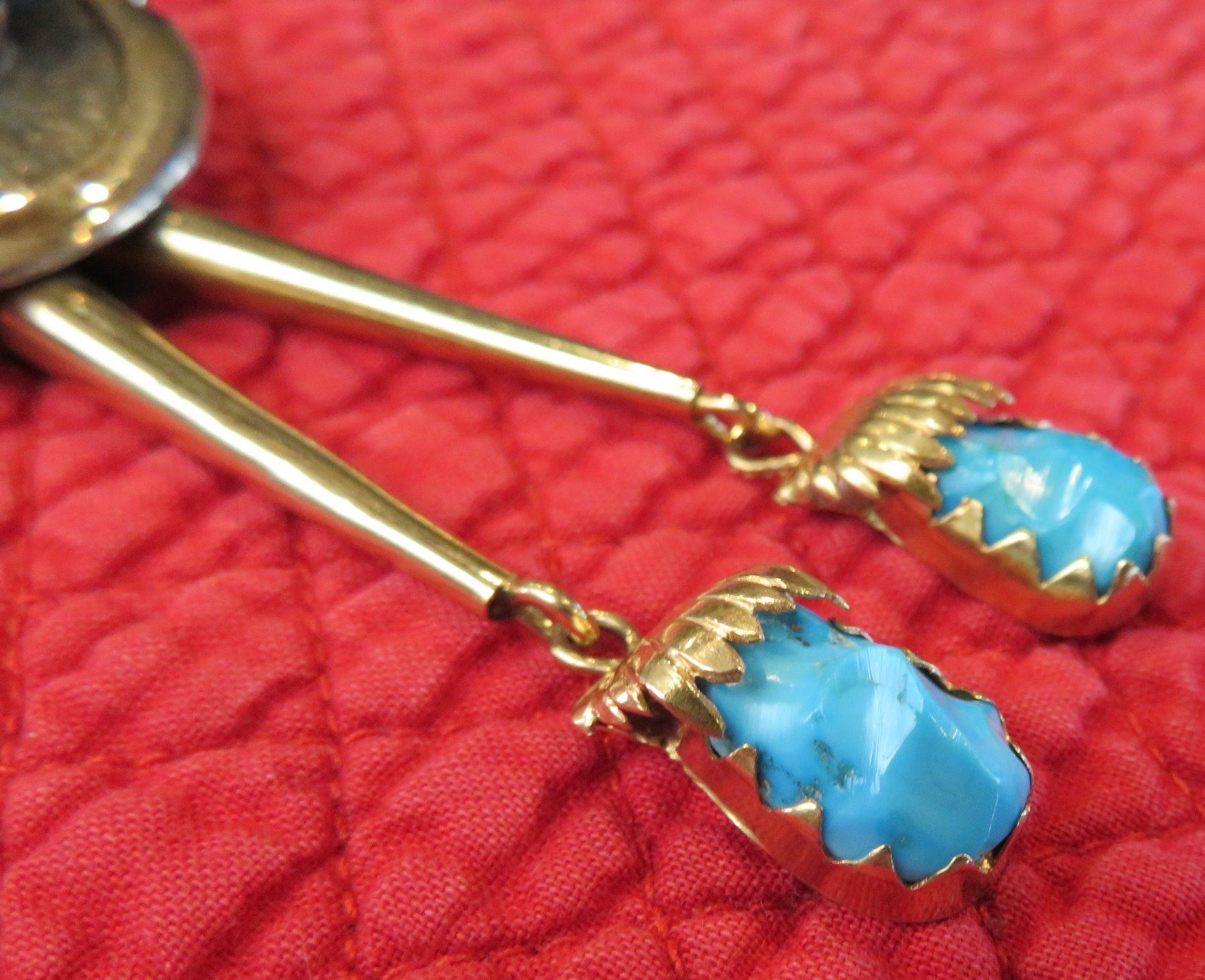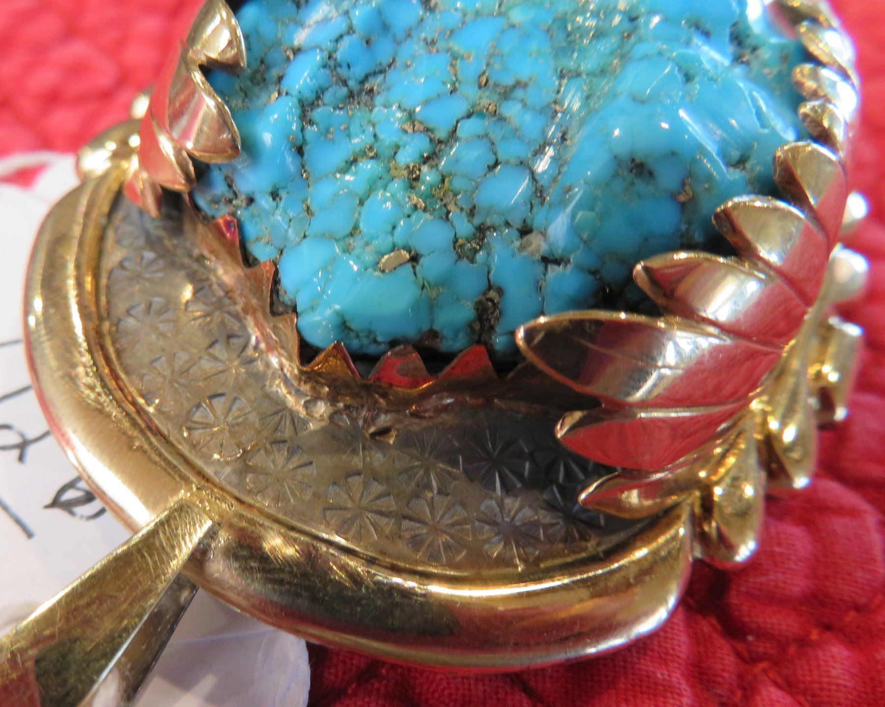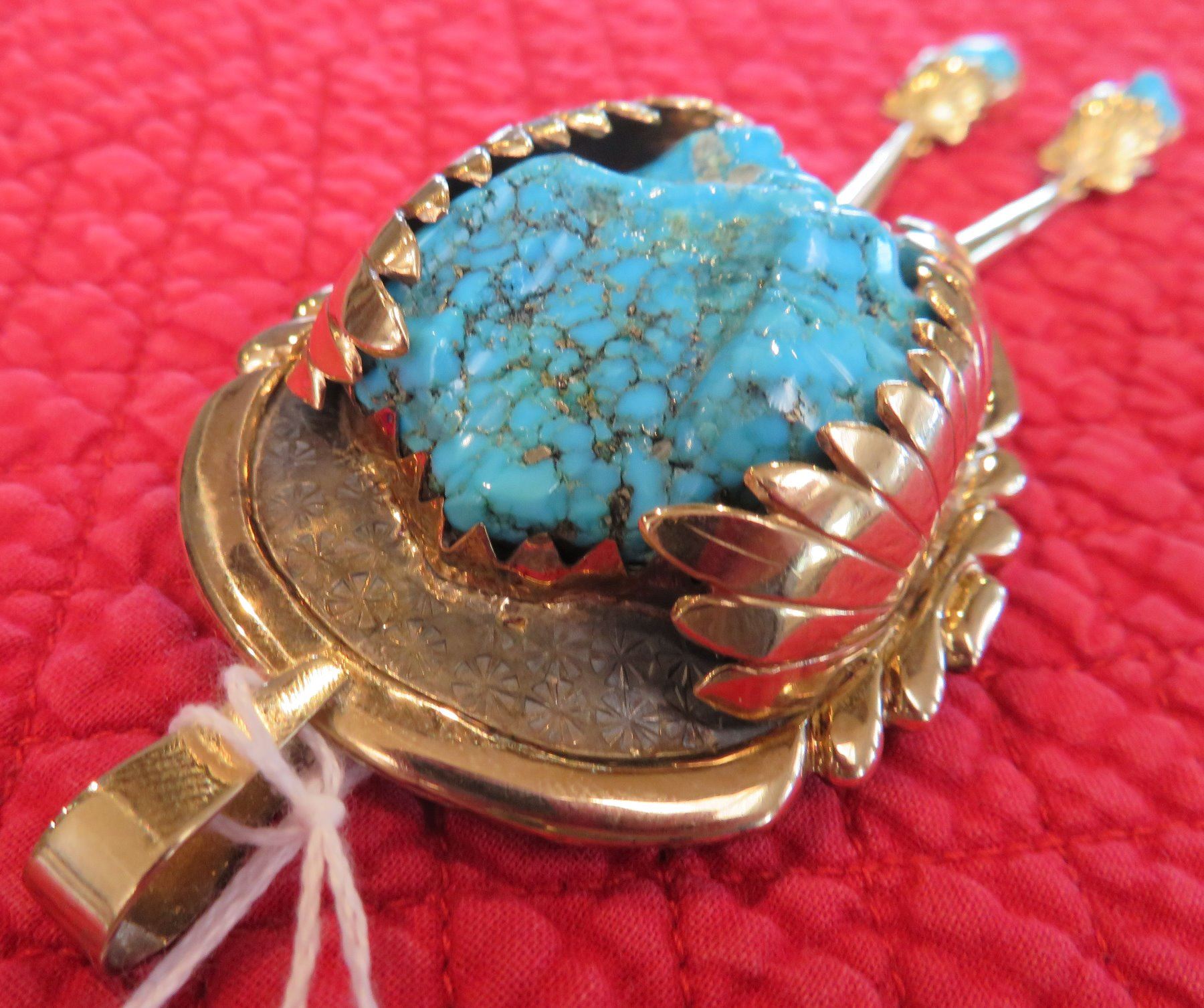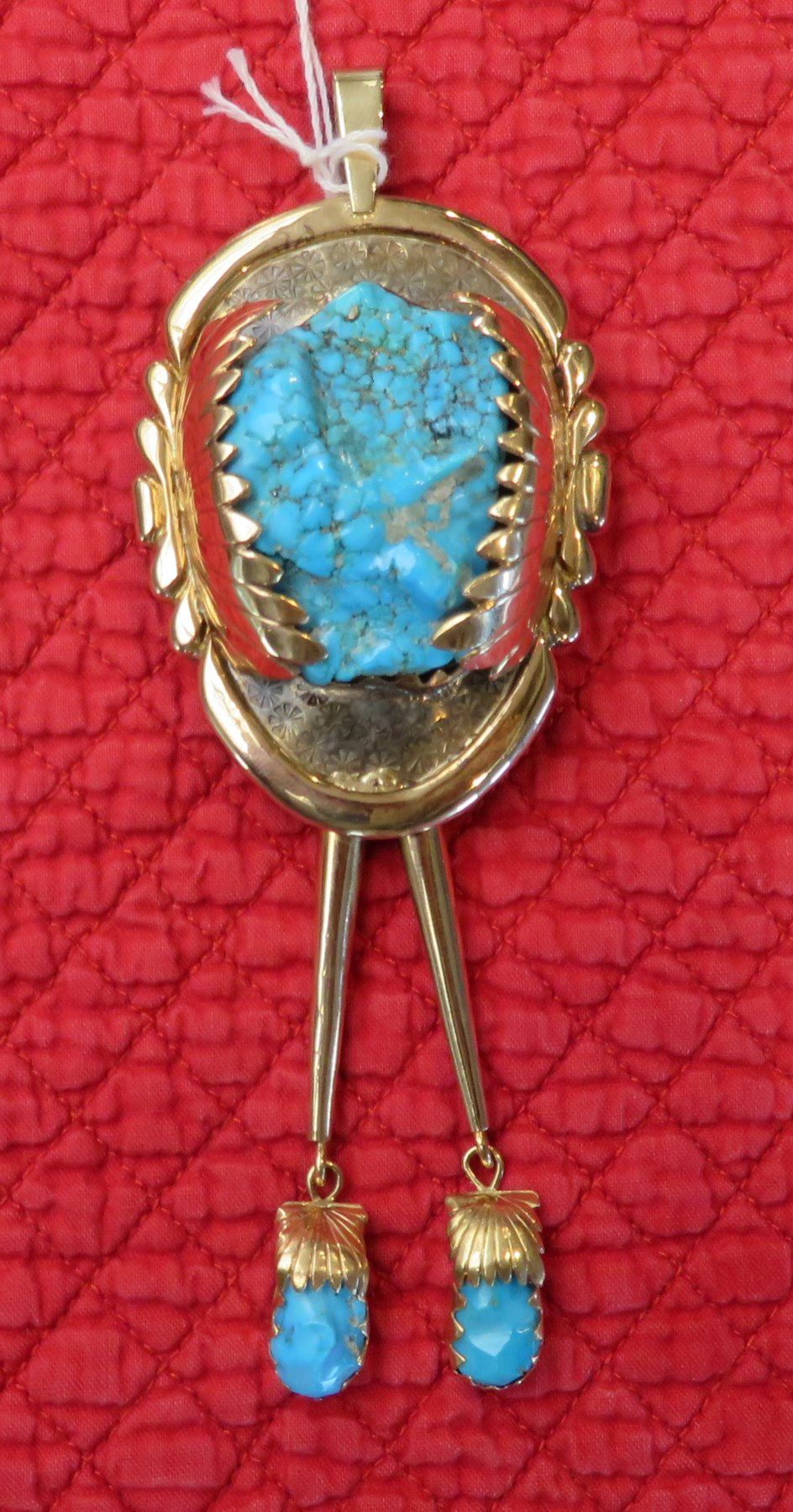 Signed 14K Gold Zuni Pendant w/Turquoise, c. 1980s. Made of 14k gold and turquoise, total length including tips is 5 5/8" x 2" x 1/2". Lot weight is approx. 90.3 grams. Large turquoise nugget, unisex. D. Harvey Collection. Condition: Very good, see images. Shipping: $24.50 w/insurance and signature, due to value.