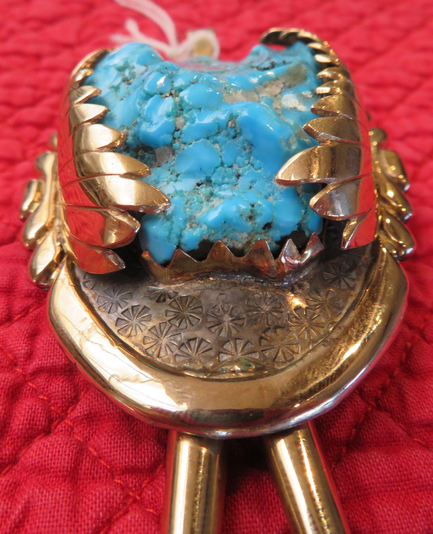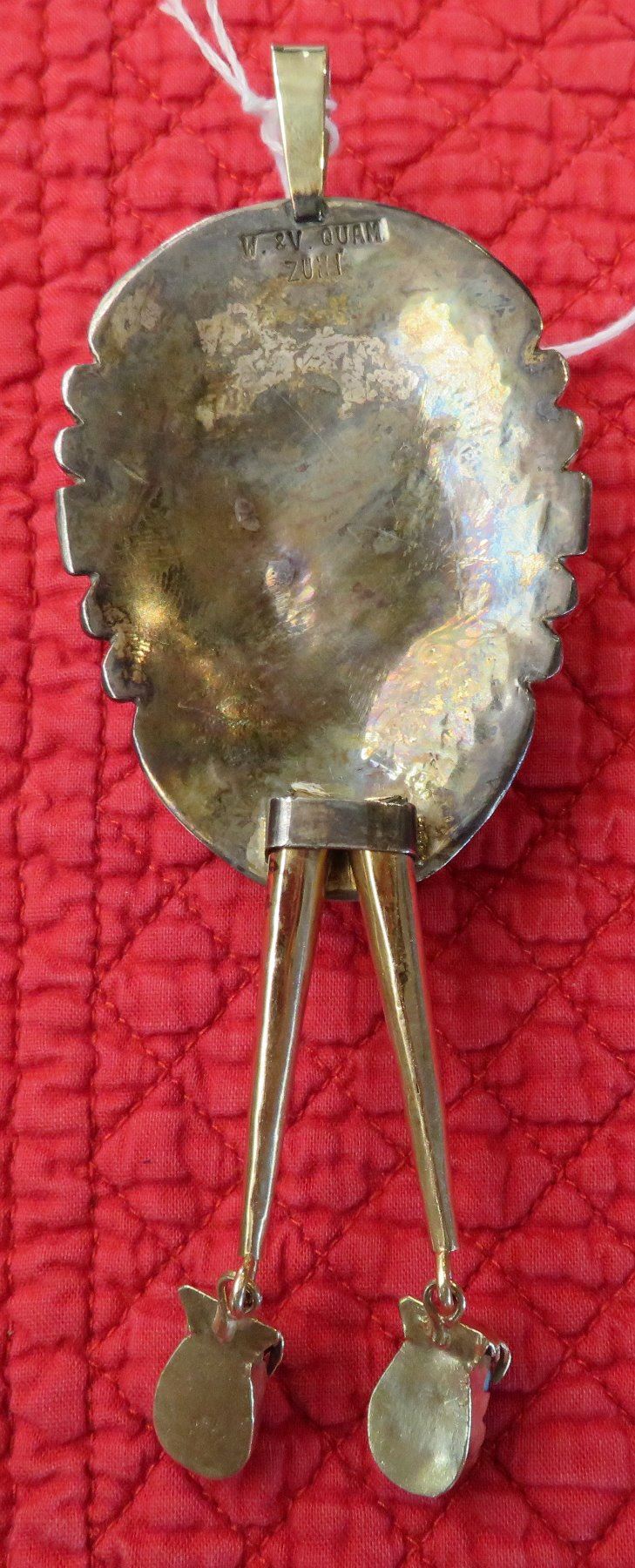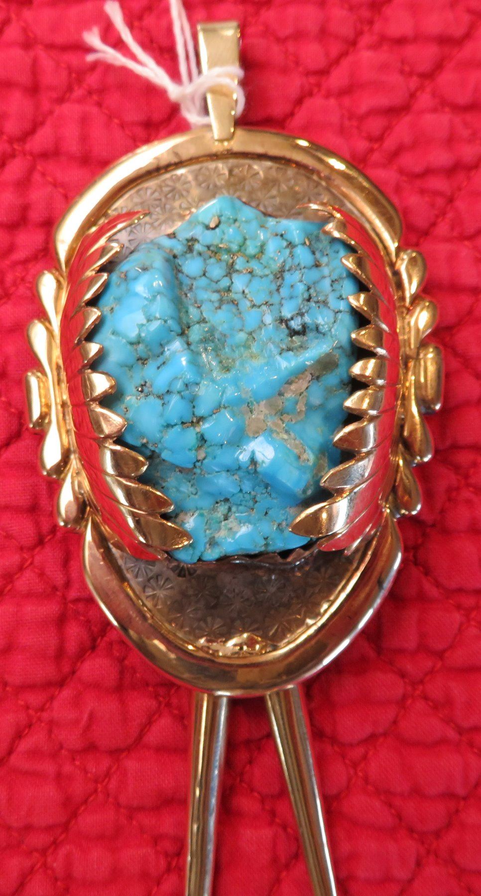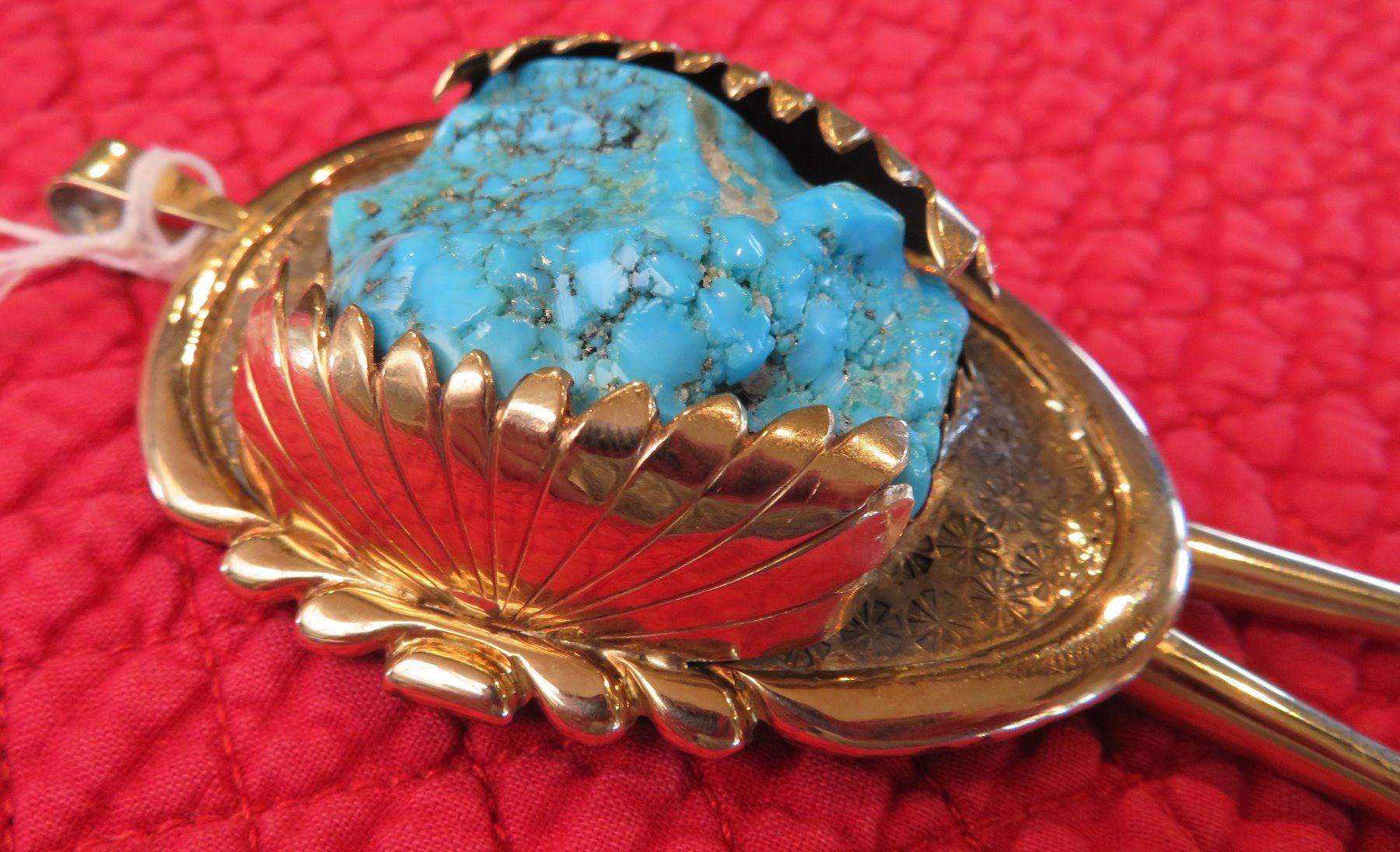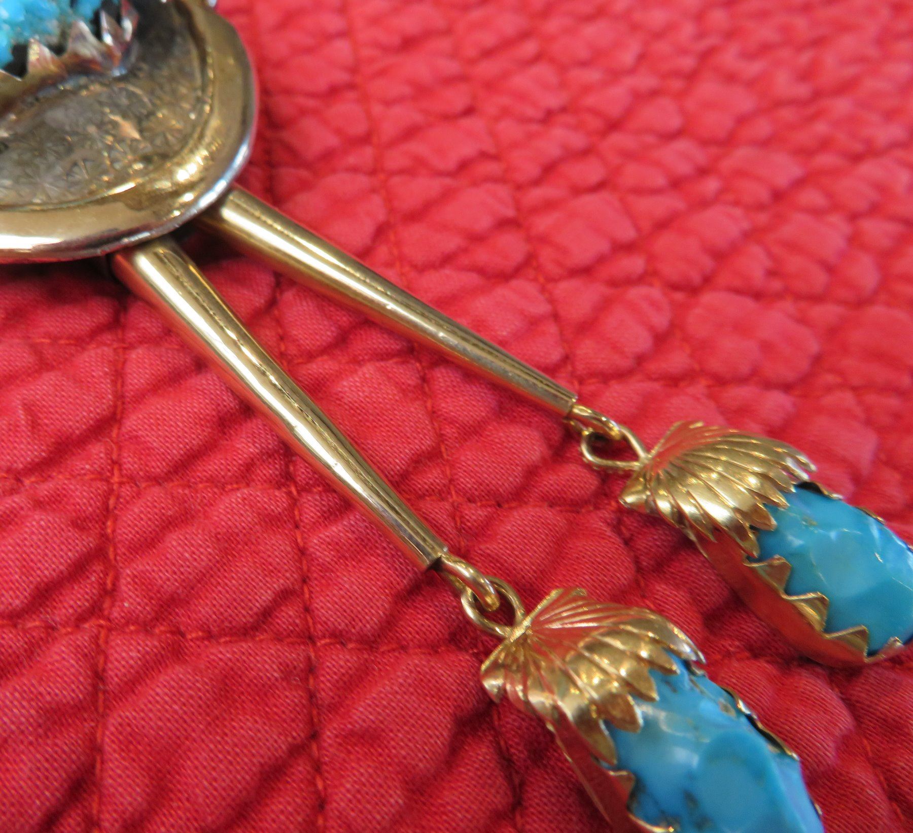 Signed 14K Gold Zuni Pendant w/Turquoise, c. 1980s. Made of 14k gold and turquoise, total length including tips is 5 5/8" x 2" x 1/2". Lot weight is approx. 90.3 grams. Large turquoise nugget, unisex. D. Harvey Collection. Condition: Very good, see images. Shipping: $24.50 w/insurance and signature, due to value.