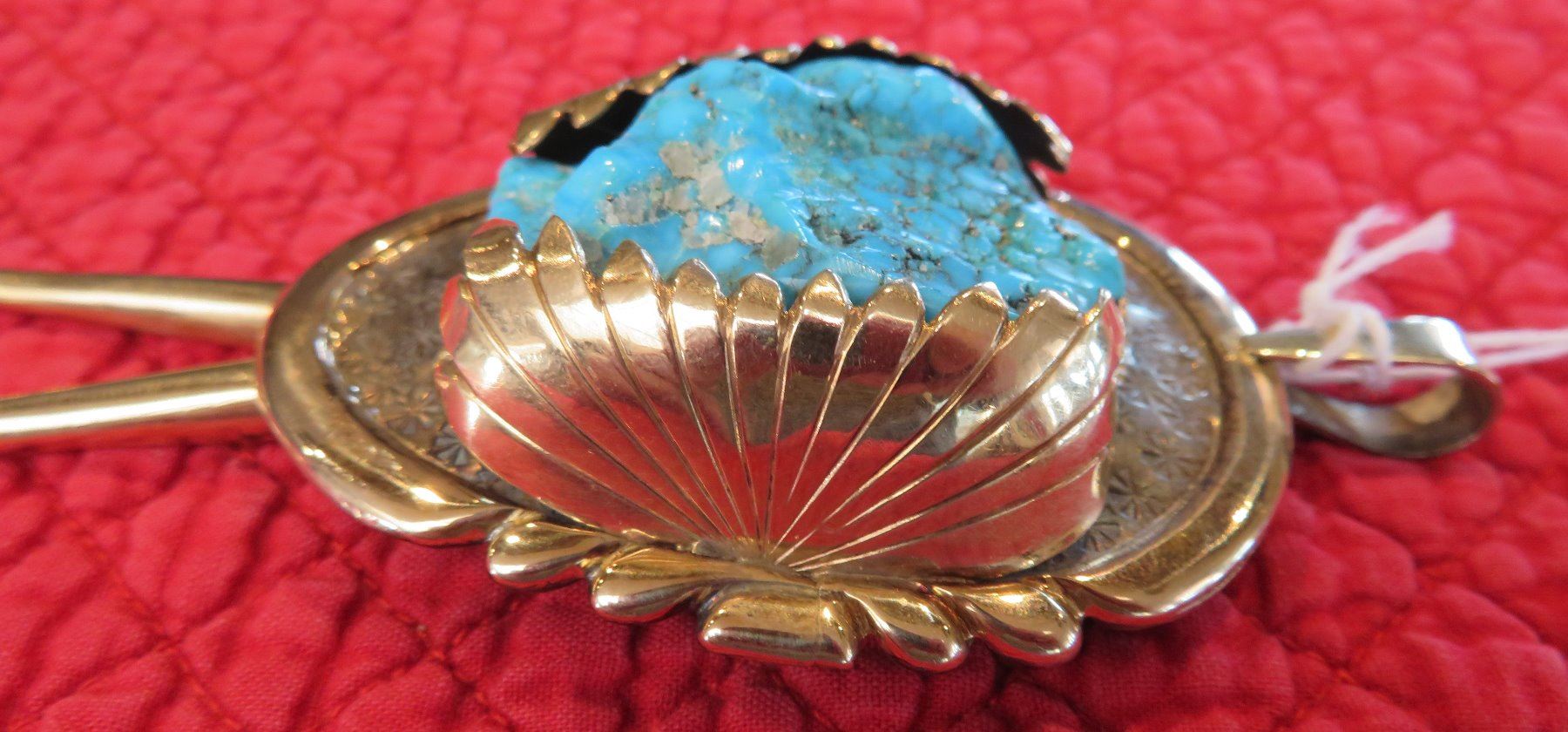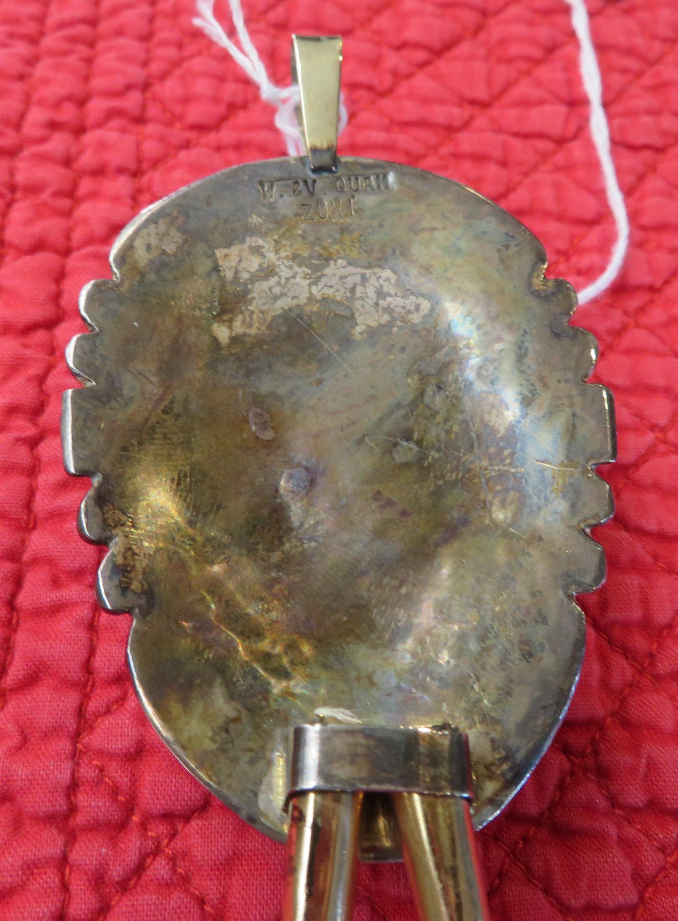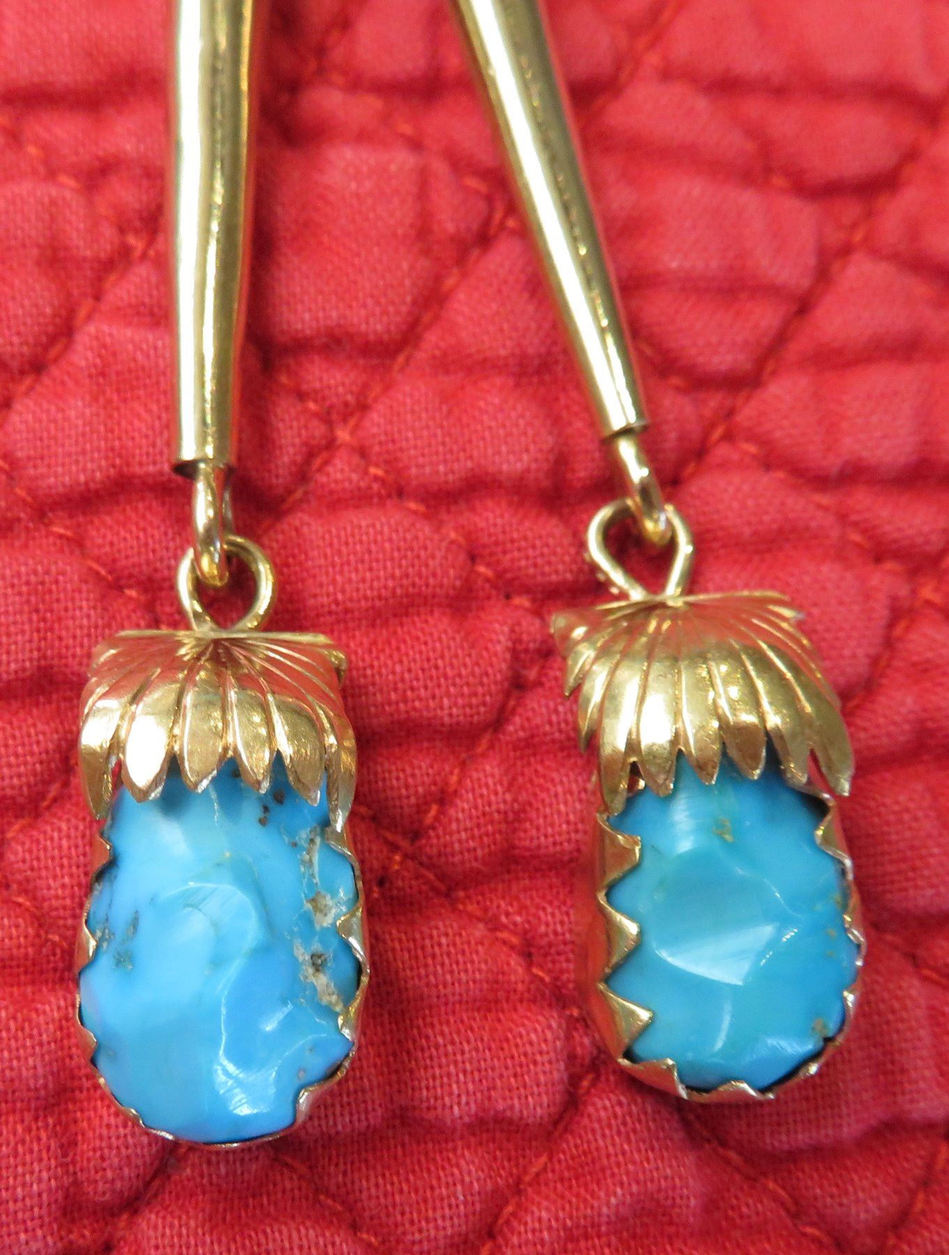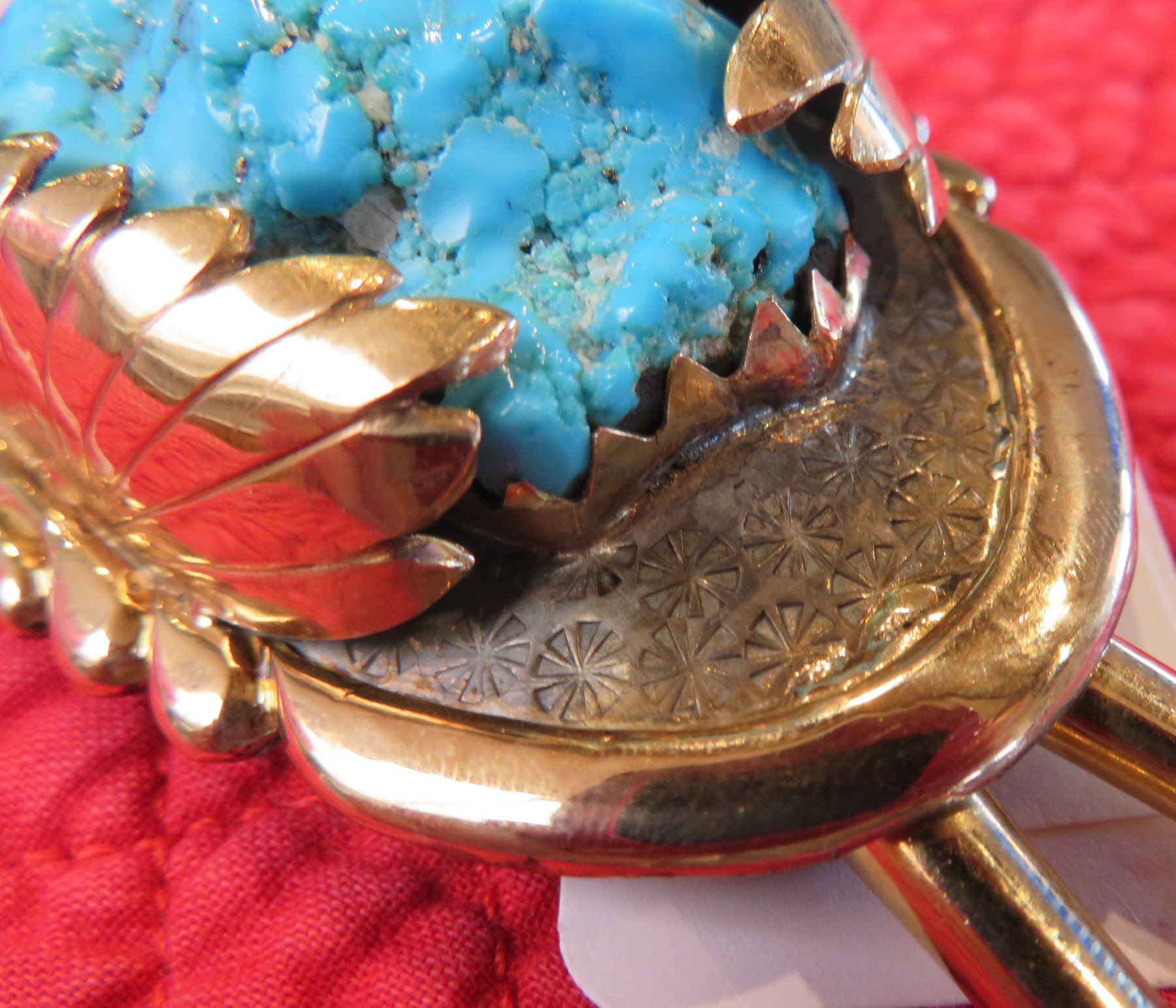 Signed 14K Gold Zuni Pendant w/Turquoise, c. 1980s. Made of 14k gold and turquoise, total length including tips is 5 5/8" x 2" x 1/2". Lot weight is approx. 90.3 grams. Large turquoise nugget, unisex. D. Harvey Collection. Condition: Very good, see images. Shipping: $24.50 w/insurance and signature, due to value.