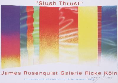 Reference #: ULGH1163-B Artist Name: Rosenquist, James Title: Slush Thrust Medium: Offset Lithograph Edition Size: unknown Year: 1970 Paper Size: 16.5 x 23.5 inches Image Size: 12.75 x 23 inches Condition: A: Mint Notes: Pencil signed original poster created by James Rosenquist for a show held at the Galerie Ricke in Koln, Germany. Only a few copies were signed at the show opening in 1970.