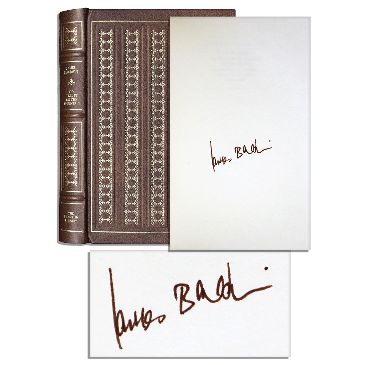 James Baldwin signs a limited edition copy of his 1953 novel ''Go Tell It on the Mountain'' clearly in brown ink on the fly-leaf: ''James Baldwin''. Franklin Library: Pennsylvania: 1979. In his introduction to this edition, Baldwin tells readers: ''...I came to write the novel...because I...was born in a certain time and place...'' The 232pp. novel, bound in red leather with gilt lettering and edges and measuring 6'' x 9.5'', is illustrated by American artist Burt Silverman. Overall in fine condition.