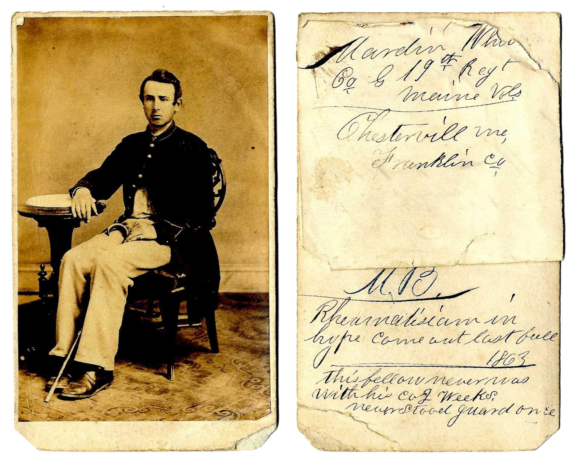 CDV of Private Marden Whittier, 19th Maine Infantry. Black ink signature on unattached 2.25'' x 2.25'' leaf reads: ''Marden Whit…[obscured]…Co G 19th Regt Maine Vols / Chesterville ME, Franklin Co''. Also includes a brief note, in black ink, on verso, indicating that Whittier suffered from ''rheumatisium'' and thus ''…never stood guard once…'' Image, measuring 2.5'' x 4'', has clipped bottom corners and significant peeling on verso. Unattached ''signature leaf'' has significant wear along edges, slightly obscuring Whittier's signature. Good.