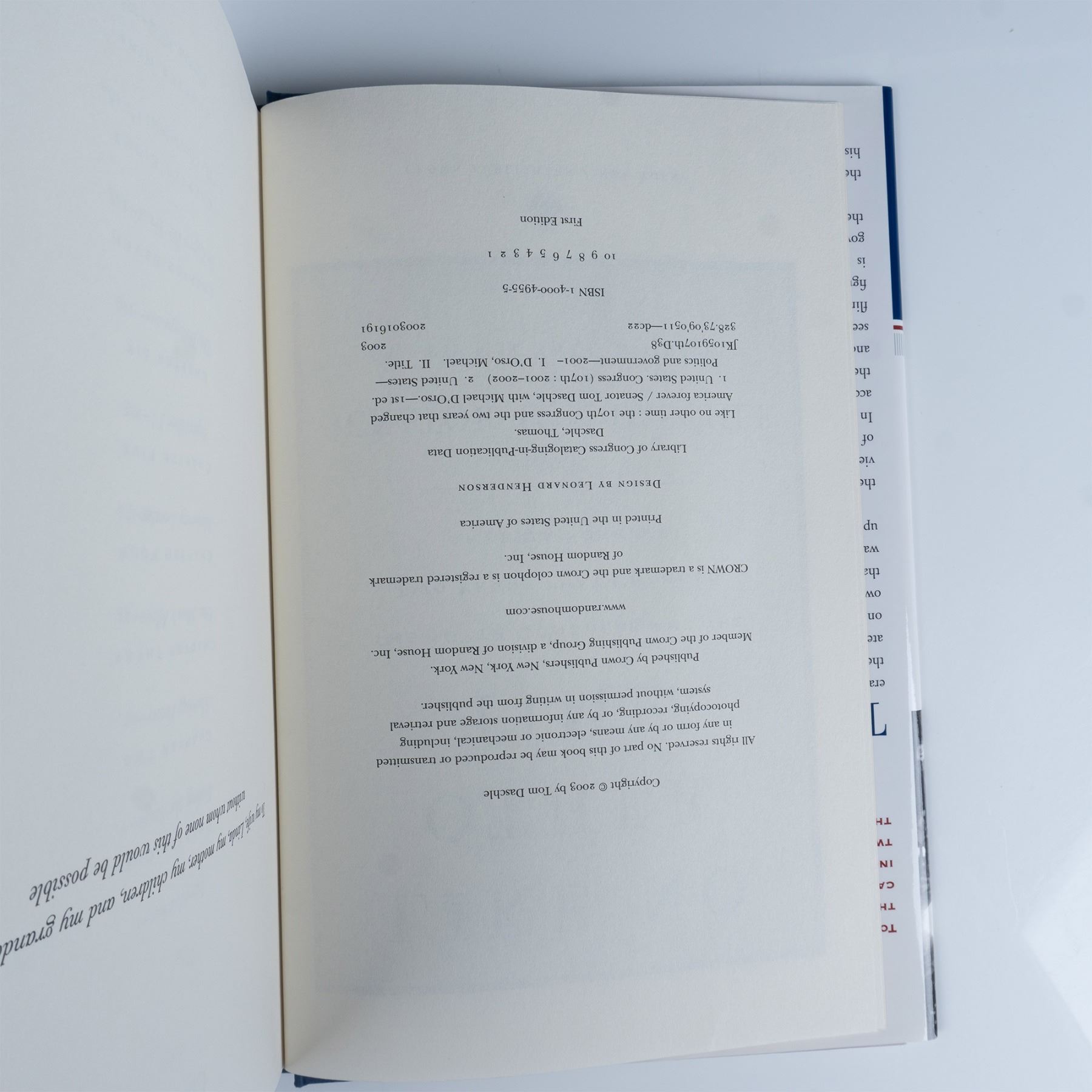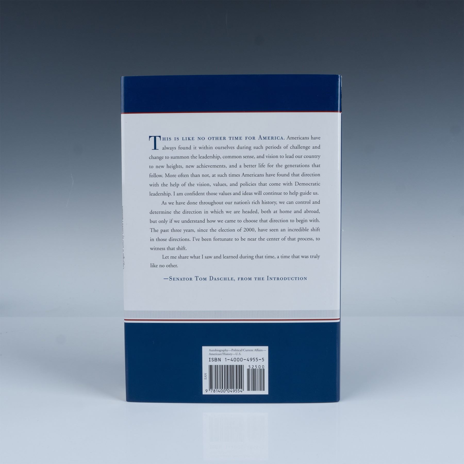 New York: Crown Publishers, 2003. First edition hardcover book, Like No Other Time: The 107th Congress and the Two Years That Changed America Forever. Autographed by Tom Daschle, former American politician who represented South Dakota in the US Senate from 1987 to 2005. Like No Other Time is Daschle's 293-page memories. ISBN: 978-1400049554.