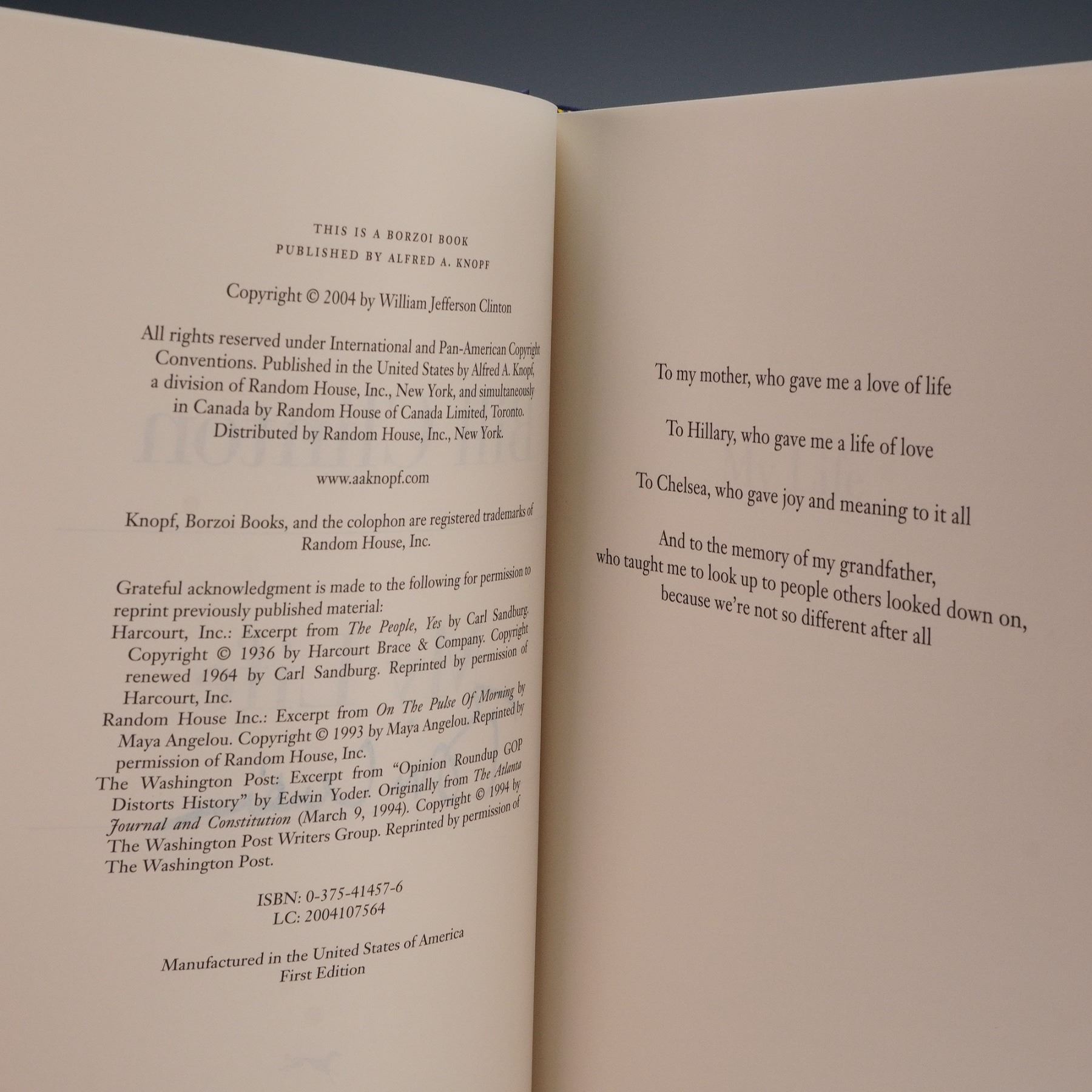 New York: Alfred A. Knopf, 2004. Autographed by Bill Clinton, the 42nd President of the United States, who served from 1993 to 2001. This 1st edition is Clinton's autobiography, recounting his journey from his youth in Arkansas through his years in the White House. The book contains 957 pages, with 32 pages of photographs, offering a detailed personal and political narrative. ISBN: 0-375-41457-6.