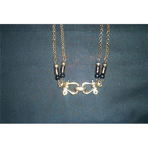I am featuring a beautiful, 9 inch long, double linked chain necklace. This necklace has a gold tone design at the bottom. Contains two linked chains. This two chained necklace also contains 4 black beads, 4 gold toned beads, along with two oblong brown decorative beads. The necklace is signed with the initial "A". Excellent Condition.
