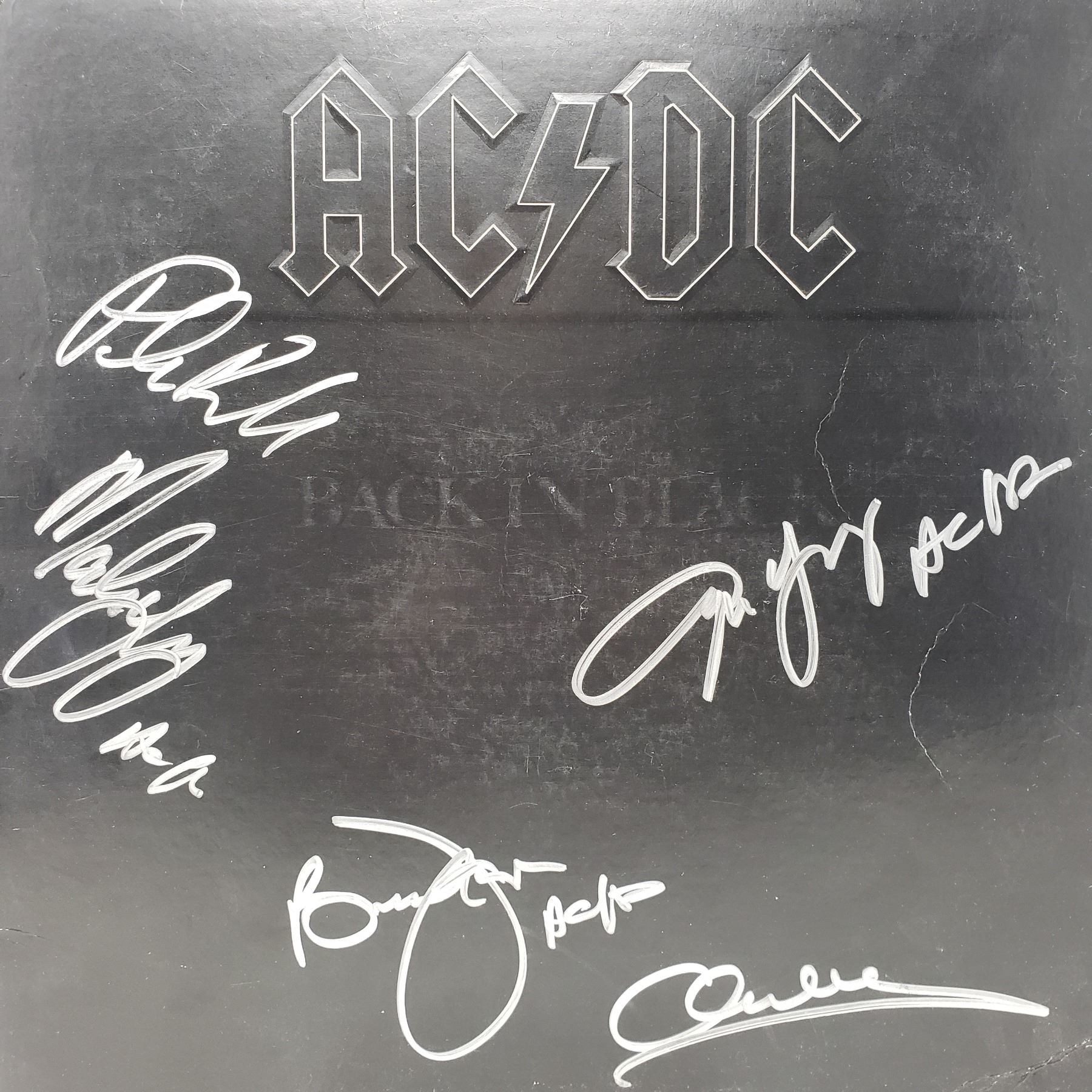 Signed by Brian Johnson, Angus Young, Malcolm Young, Cliff Williams, and Phil Rudd