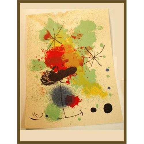 </font></strong>This litho can referenced on a few art sites and I have included a photo of one of the references . As you can see it in great condition is priced at $650.00.I have more photos of this if you want to email me. This abstract is done by Joan Miro. Joan Miró i Ferrà (April 20, 1893 ? December 25, 1983) was a Catalan (Spanish) painter, sculptor, and ceramist born in Barcelona, Catalonia, Spain to the family of a Goldsmith and Watchmaker. His work has been interpreted as Surrealism, a sandbox for the subconscious mind, a re-creation of the childlike, and a manifestation of Catalan pride. In numerous interviews dating from the 1930s onwards, Miró expressed contempt for conventional painting methods and his desire to "kill", "murder", or "rape" them in favor of more contemporary means of expression. This is one of the rarer ones on the market and has a higher price than most when in perfect condition. As you can see it has some problems, which when framed properly are almost unnoticable. ( see closeups) . When asked how he came up with these original paintings he said "How did I think up my drawings and my ideas for painting? Well I'd come home to my Paris studio in Rue Blomet at night, I'd go to bed, and sometimes I hadn't any supper. I saw things, and I jotted them down in a notebook. I saw shapes on the ceiling..?. Obviously an artist with a very creative imagination! Many of his pieces are exhibited today in the Fundació Joan Miró in Montjuïc, Barcelona and the U.S. National Gallery ...