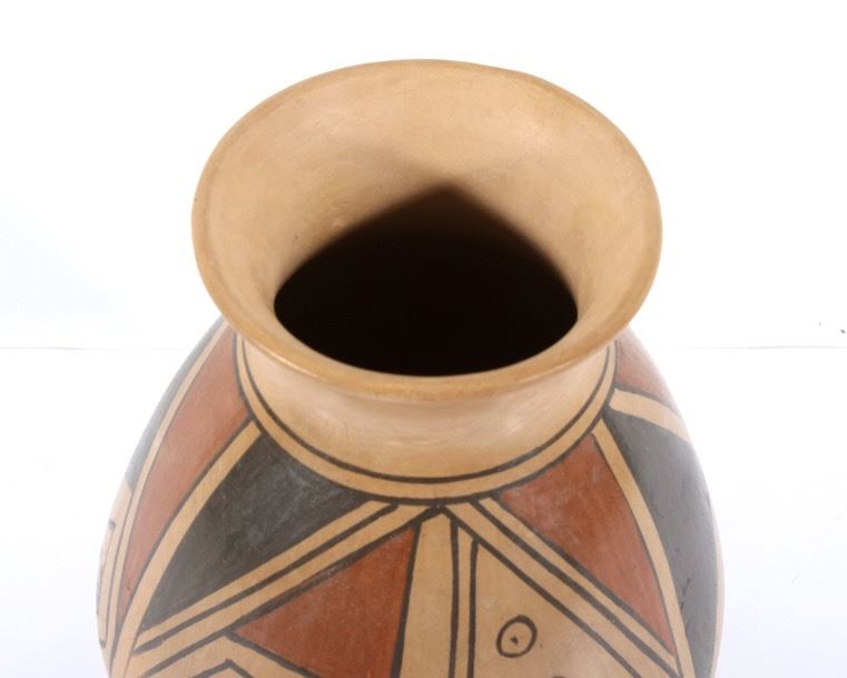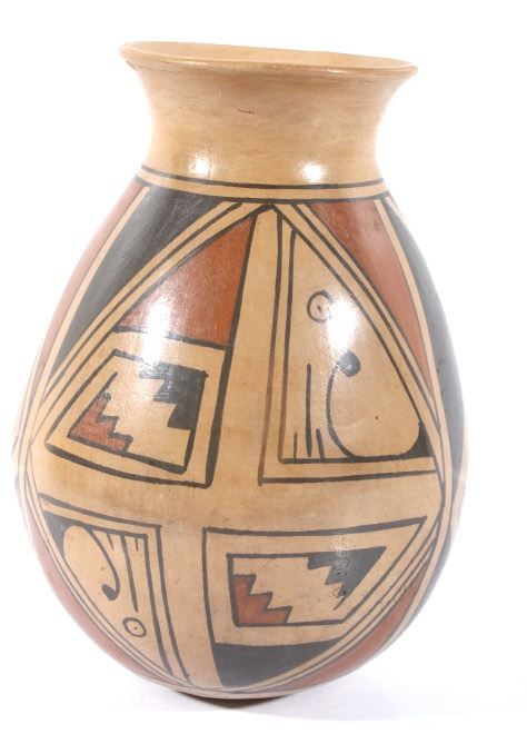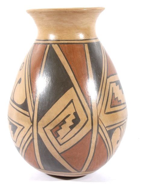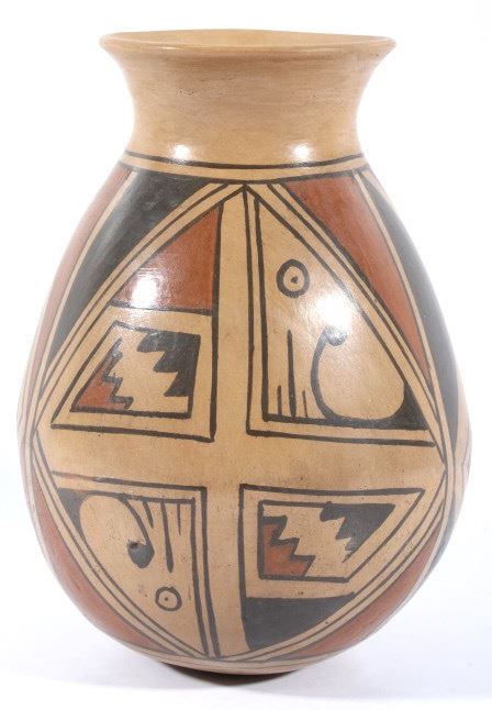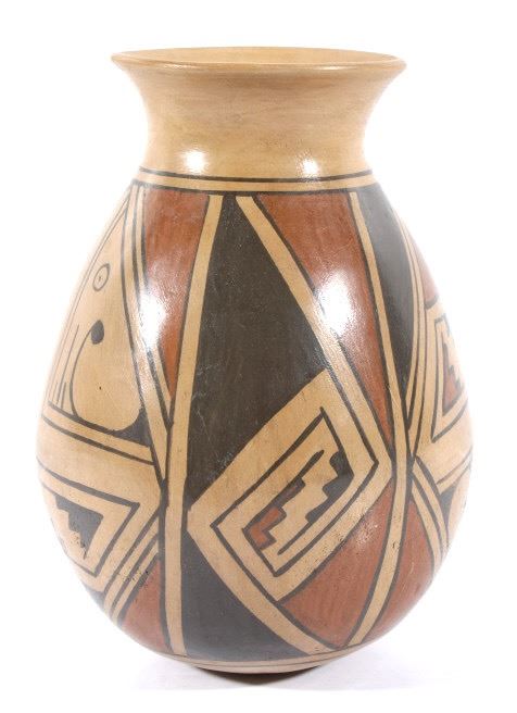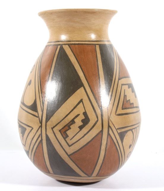 Featured in this lot we have a signed Acoma Native American polychrome pottery jar originating from the early to mid 20th century. The jar shows wonderful Acoma geometric polychrome designs in black and red across the exterior of the piece. The jar is signed across the bottom reading "Winuels Olivia". The jar shows good condition overall and measures 9 1/4" tall with a diameter of approximately 6 1/2".