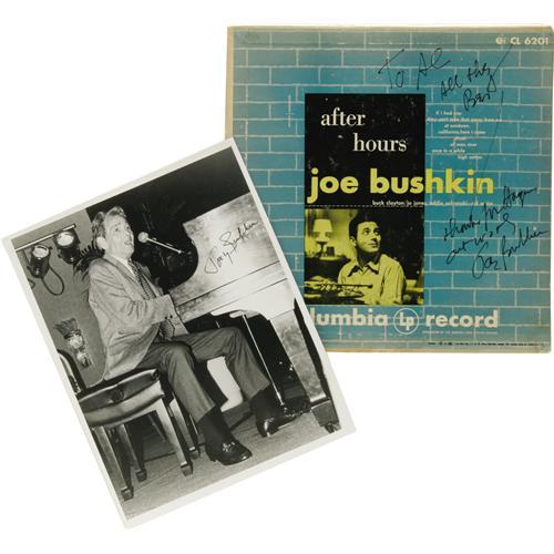 <B>Signed "After Hours - Joe Bushkin" Columbia CL 6201 10-inch LP, with Autographed Al White Silver Print (1952).</B></I> Pianist Joe Bushkin is joined by Buck Clayton (bass), Eddie Safranski (bass), Sid Weiss (bass) and Jo Jones (drums) for six standards and a Bushkin original. The album cover was signed by Bushkin. Also included in this lot is an Al White "jazz party" silver print, also autographed by Bushkin. Condition: VG+/VG-. <I>From the Al White Jazz autograph archive.</B></I>