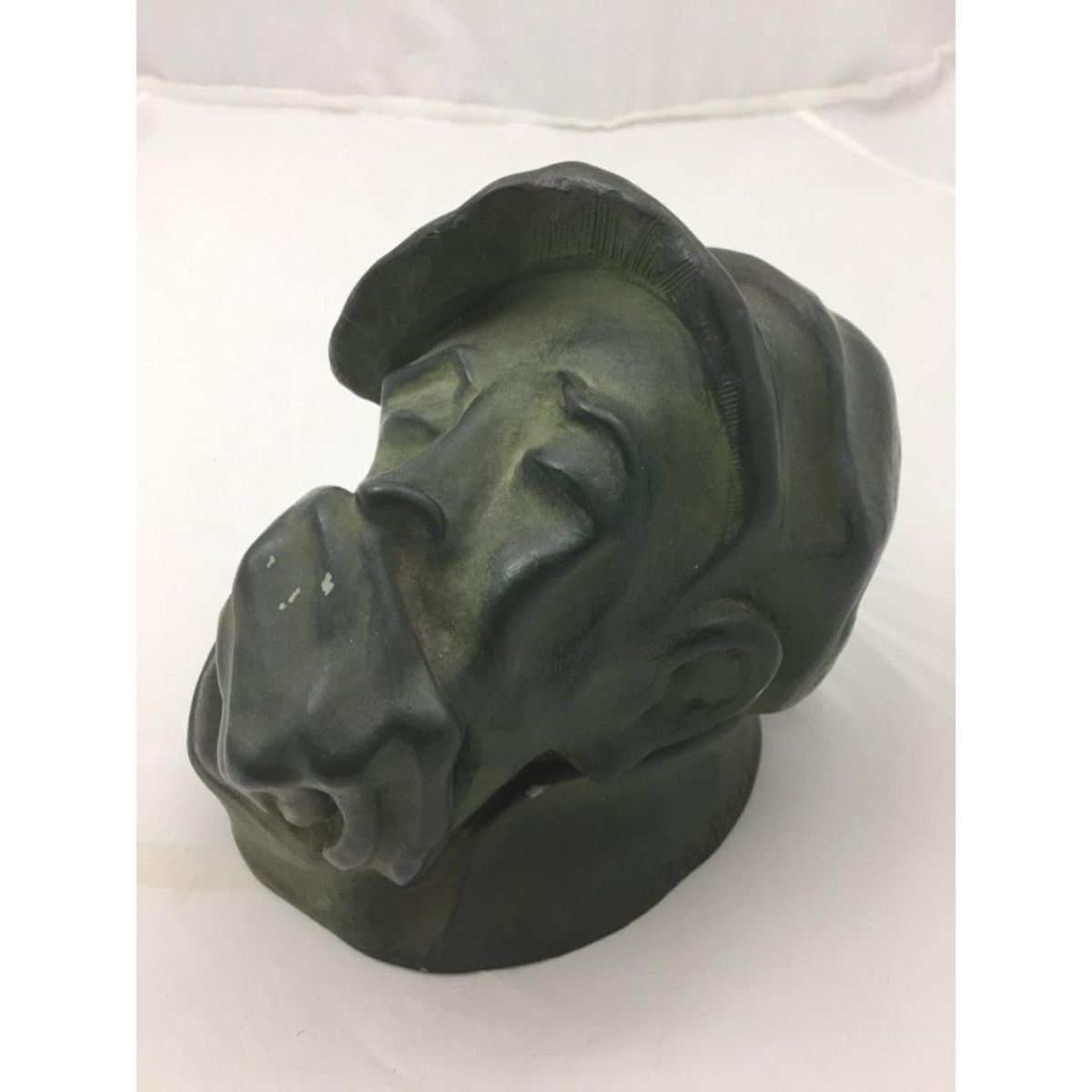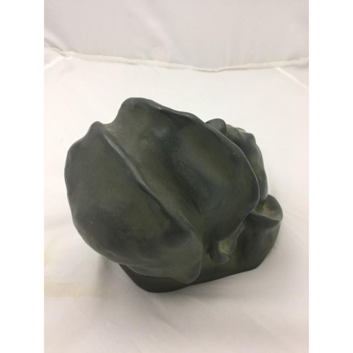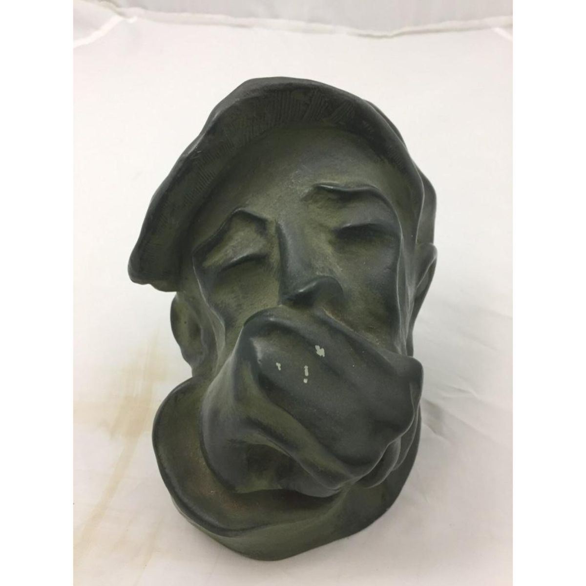 Depression-themed figural alabaster sculpture titled "Snobird" by Aza Rogers (1908-1995). Aza is not well known, but the expertise in her sculpting ability is apparent. Approxi 5†W, 6†d, 6†H & weighs 4 pounds. * no chips to the artwork, but there are minor areas where the green paint has flaked off.Â