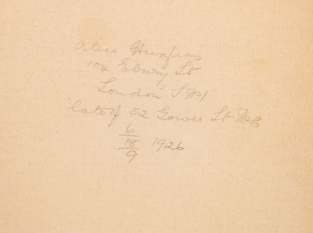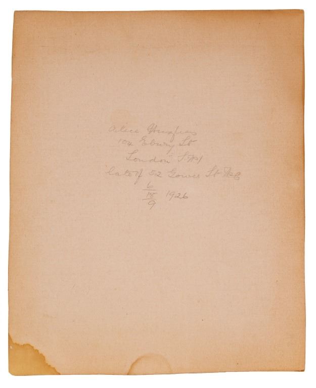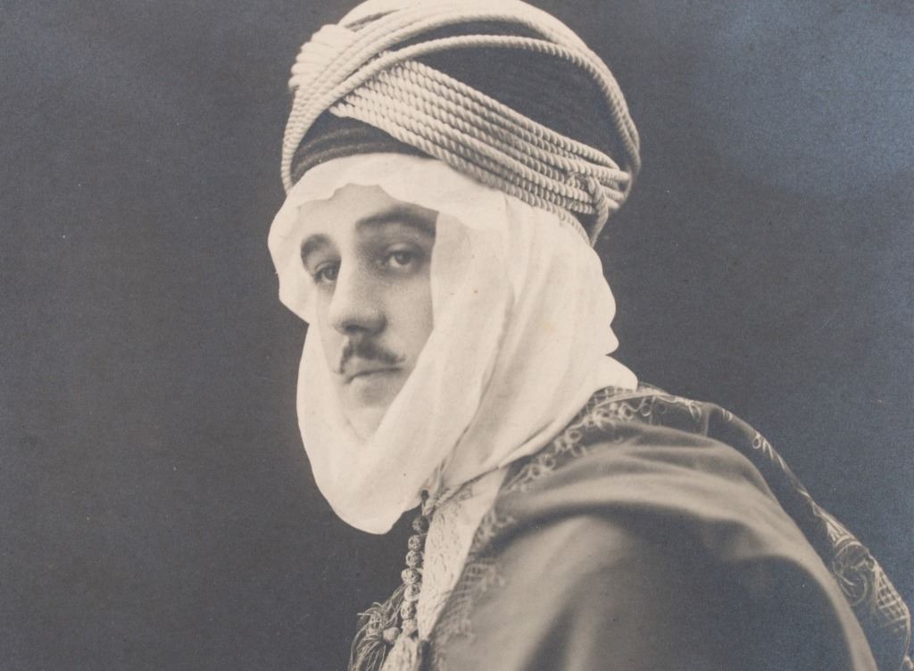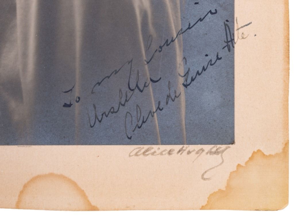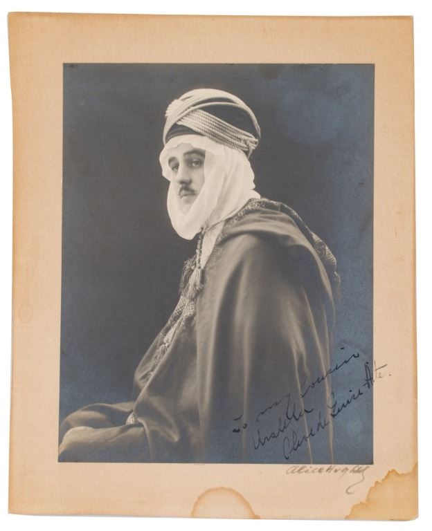 Item/Description: Personalized and signed original photograph by photographer, Alice Hughes. Pose of a noble gentleman in 19th Century Middles Eastern, Algerian dress identified as "Clive de Guire-Aite". The written inscription by Ms. Hughes reads in part: " To my cousin, Ursula, Olive de Guire Aite ". Signed by artist, lower right Alice Hughes. On reverse, is the photographer's address in her hand.