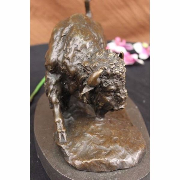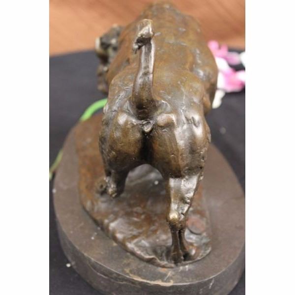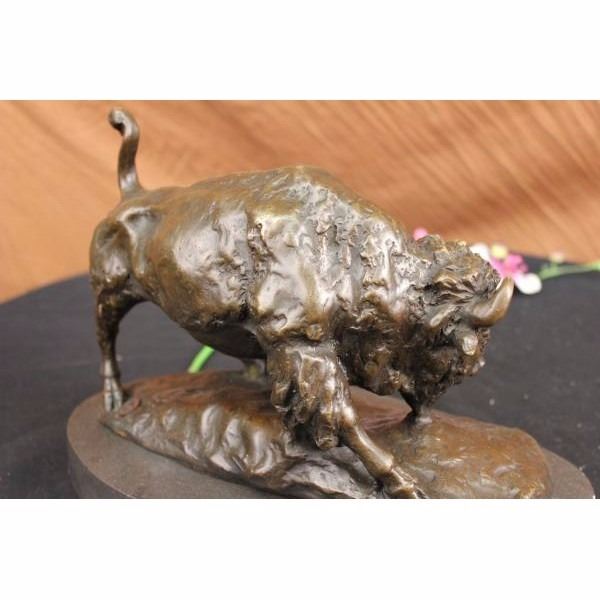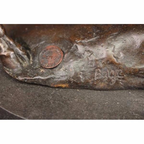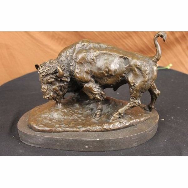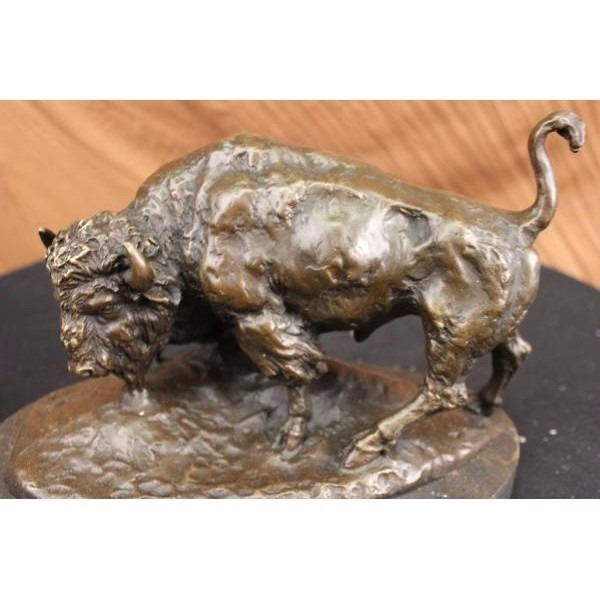 Bulls are much more muscular than cows, with thicker bones, larger feet, a very muscular neck, and a large, bony head with protective ridges over the eyes. These features assist bulls in fighting for domination over a herd, giving the winner superior access to cows for reproduction.[ The hair is generally shorter on the body, but on the neck and head there is often a "mane" of curlier, woolly hair. Bulls are usually about the same height as cows or a little taller, but because of the additional muscle and bone they often weigh far more. This bull is leaning his head a little down and he is eating greens off the floor. This sculpture was cast using the ancient old "Lost Wax Method" stained in brown patina finish for preservation. 100% handmade and 100% bronze, mounted atop a black marble base and is signed Barye. Condition : This sculpture is in perfect condition. Bronze Dimensions with Marble Base:Height 8" x Width 14" Marble Dimensions: Diameter 13". Height without base: 7 " Weight : 13 LBS Inventory: 35Y5855053