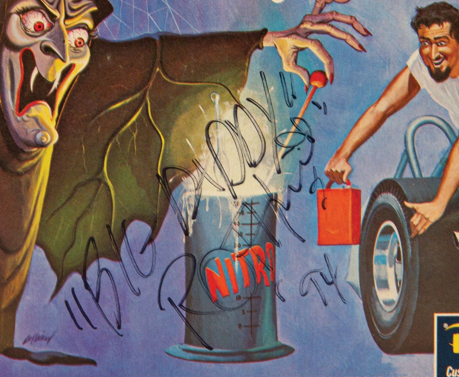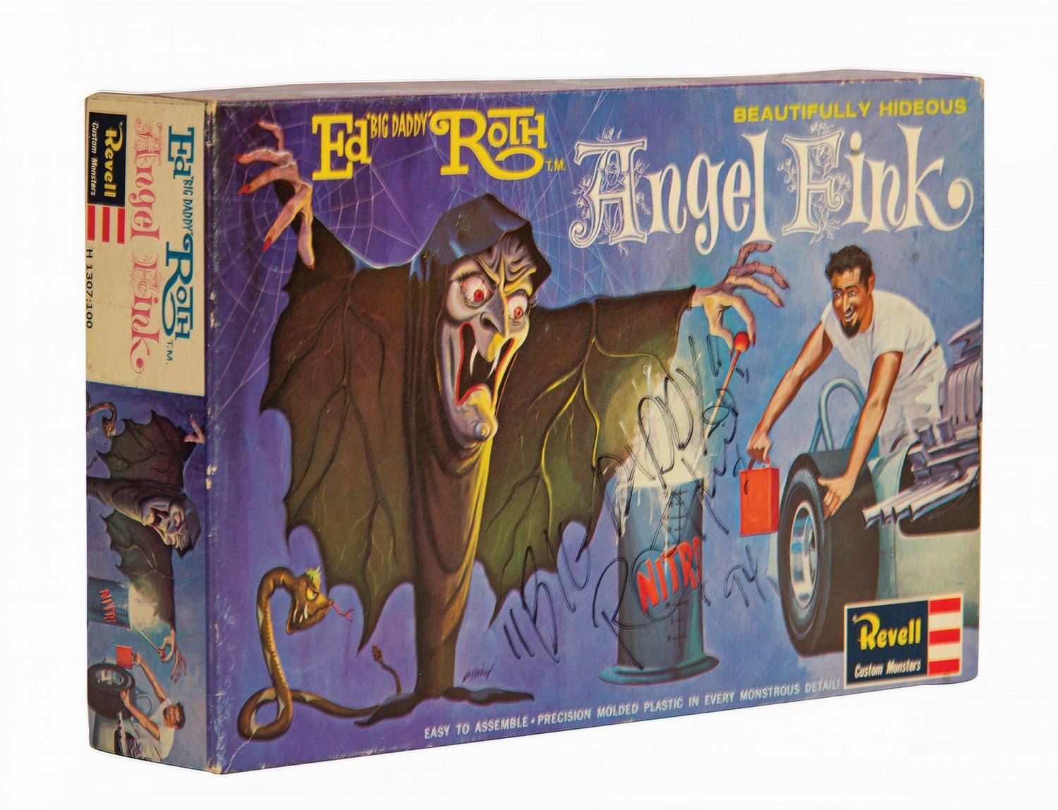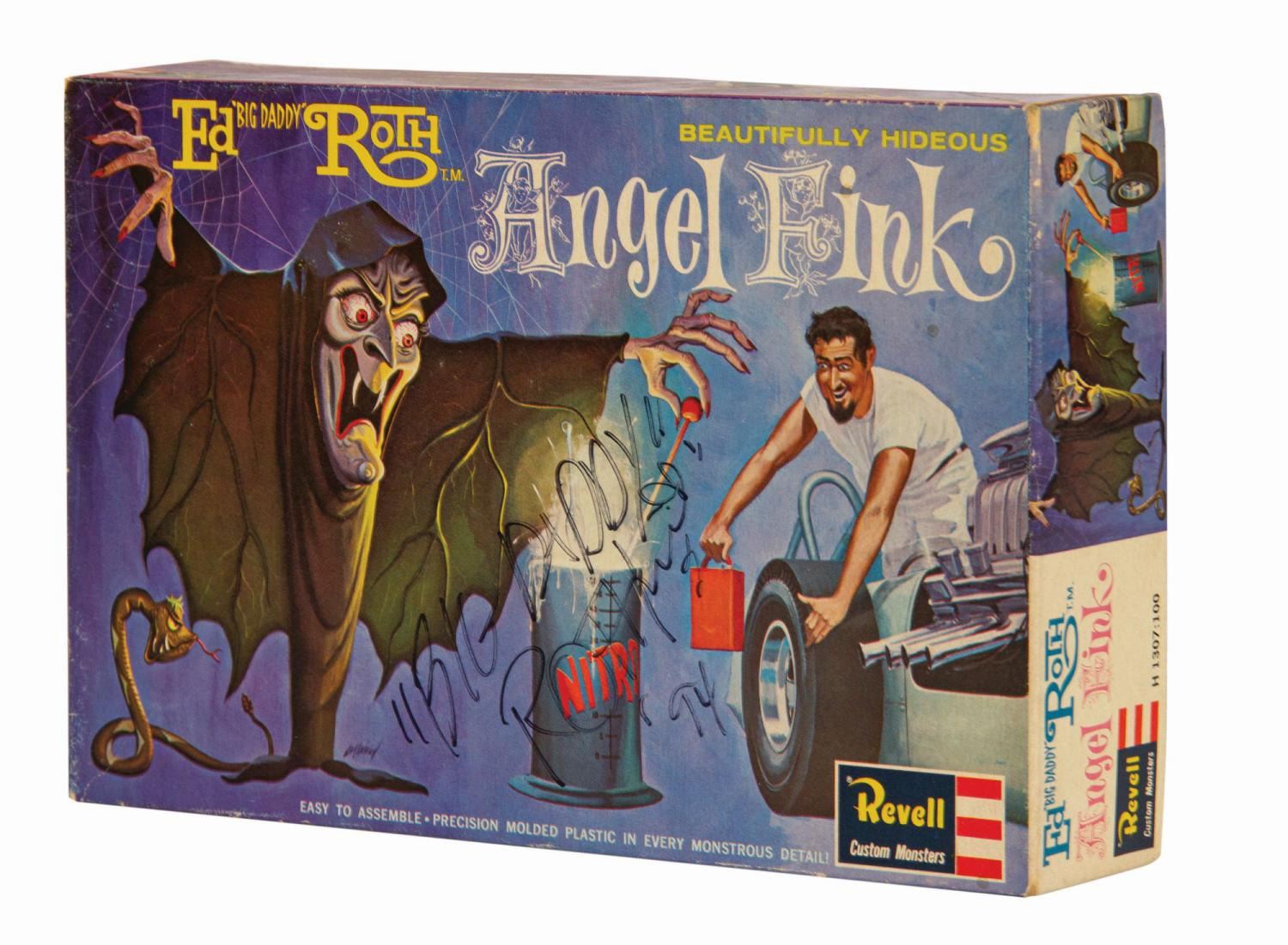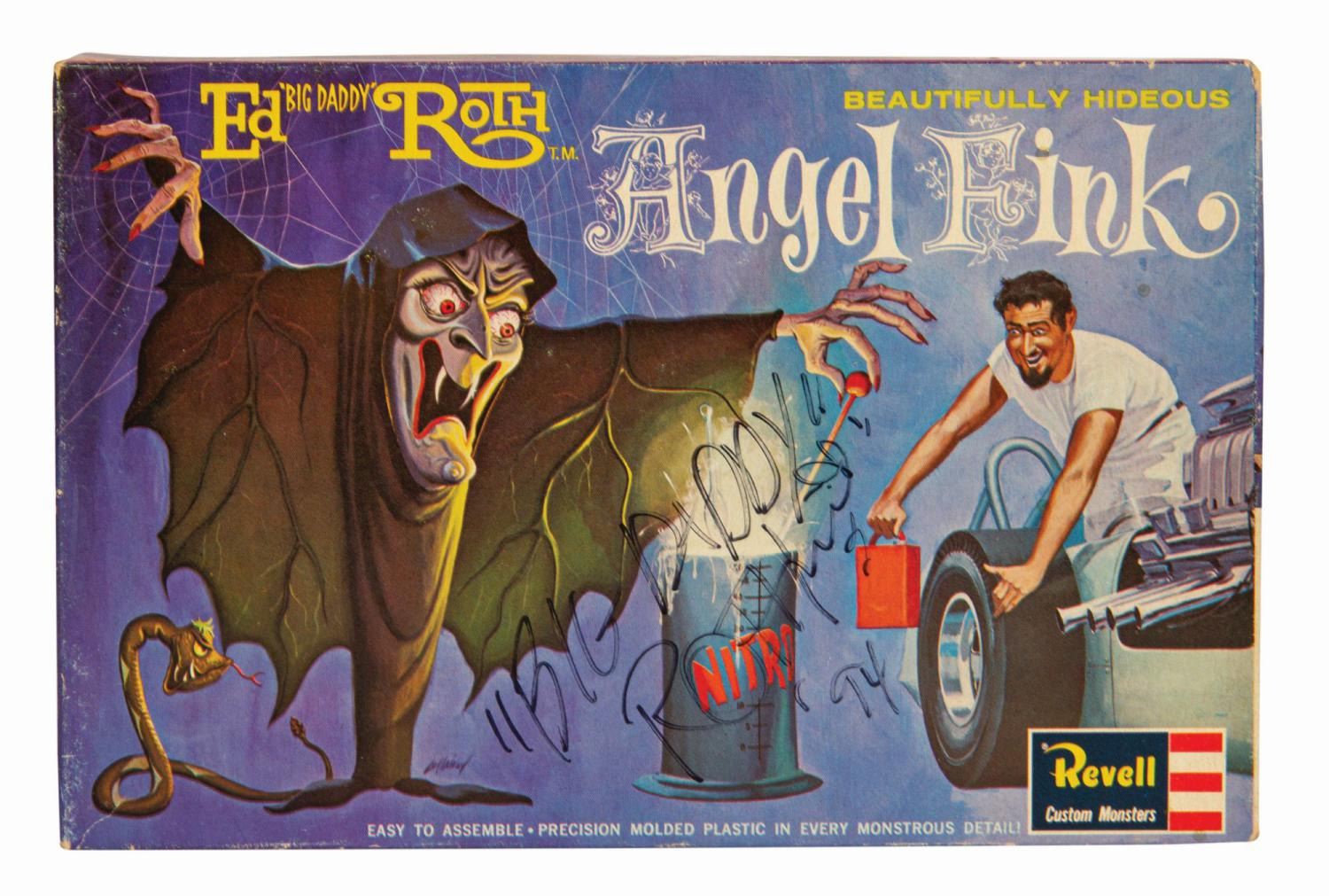 (Revell, 1964) A vintage Revell figural model kit of the character Angel Fink from the monster menagerie of legendary car customizer and visual artist, Ed "Big Daddy" Roth. This particular kit once belonged to Roth himself, and now comes from the personal collection of his son, Darryl Roth. The white plastic model pieces remain attached to their runners where applicable and are sealed along with the instruction manual in their original plastic bag, as issued. The model components are housed in the original paper box, which is signed on the lid by Ed Roth and dated "94." The box measures 6.25"x9.5" and 2.25" tall. The kit is in overall very good condition. The box exhibits some minor wear to edges and spot grease staining to bottom. The model elements are clean and as-new.