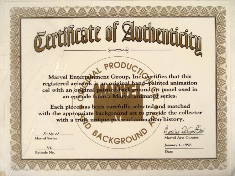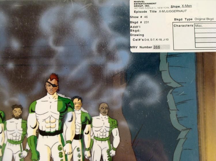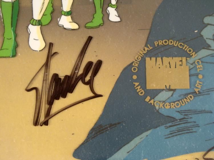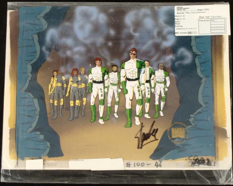 This is an original signed production cel and background from the hit series X-Men. Stan Lee signature is located at the bottom of cel in black sharpie. * Under a cloud of increasing anti-mutant sentiment, Professor Xavier creates a haven at his Westchester mansion to train young mutants to use their powers for the benefit of humanity, and to prove mutants can be heroes. Xavier recruited Cyclops, Iceman, Angel, Beast and Jean Grey calling them "X-Men" because they possessed the "x-gene", an ability normal humans lacked. Early issues introduced the team's arch enemy, Magneto and his Brotherhood of Evil Mutants, who would later battle the X-Men for years. * Original Animated Cel Overall Size of the Cel: 10 1/2" x 12 1/2" Overall Size of the background: 10 1/2" x 14 1/4" Very Good Condition This is an original hand-painted cel set-up used in the production of an episode of X-Men titled "Juggernaut." Each one-of-a-kind set-up represents a slight change in position of the characters. When individually photographed and projected in rapid succession, the images appear to move. * To create production cels, the original animator's drawing is transferred onto an acetate cel (by hand-inking and/or photo copying). The cel is then hand-painted on the reverse side. The background accompanying this set-up is an original production background. * The cel and original background is ready to be matted and framed. The animators are located at the bottom of the cel and background. A ceritificate of Authenticity from Marvel is on the back of background. The Marvel Seal is located at the bottom right of the cel. The cel and background are in a protective sleeve An information card about the episode is located at the top right of the protective sleeve. *