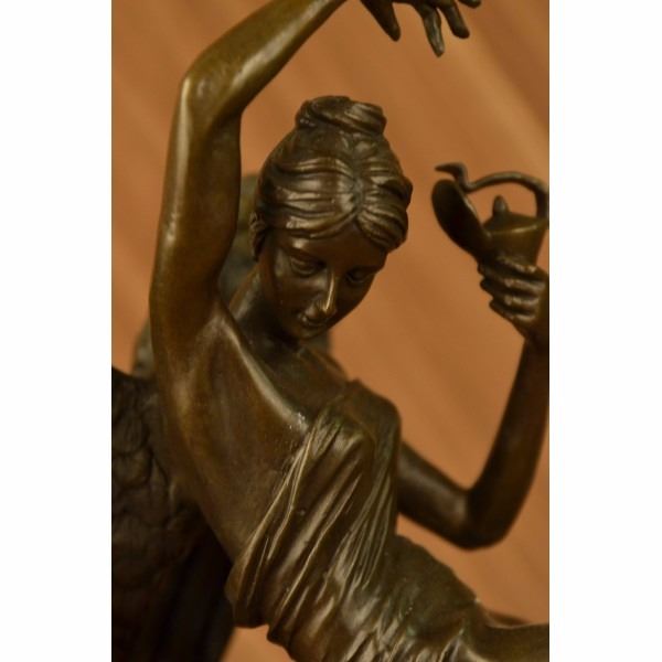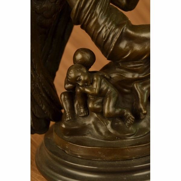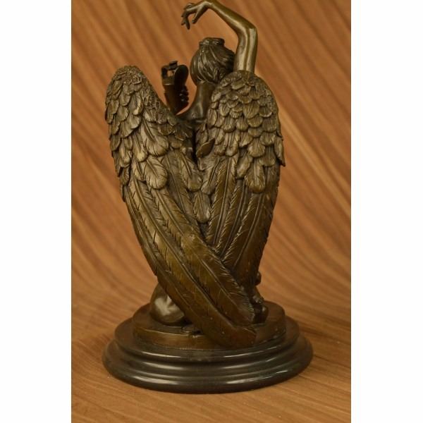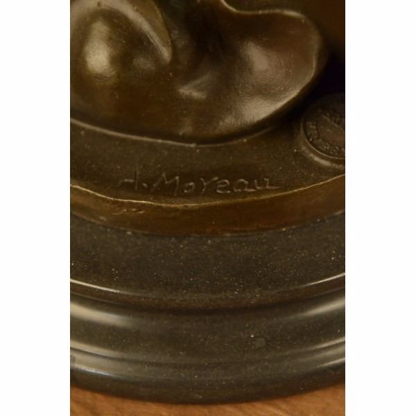 The cherubic angel seems to have just landed from great heights amongthe ruins of an old enchanted garden. She holds herself steady fromthe fall to earth on top of a large stone. Her wings begin to fluttershut as her eyes begin to assimilate and search for the divine purposeof her journey. This 100% handmade bronze sculpture was captured usingthe archaic method of lost-wax casting and stained with a brown patinafinish for perpetuation. He is mounted upon a black marblebase and is signed A.Moreau. Condition: This sculpture is in perfect condition. Bronze Dimensions with Marble Base:Height 14" x Width 10" Marble Dimensions: Diameter 8" Height without base:13" Weight : 17 LBS Inventory : 53X20699135