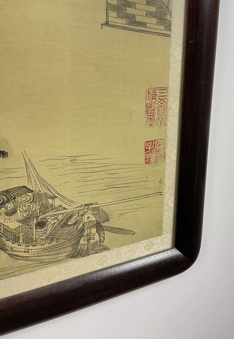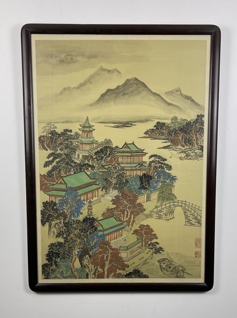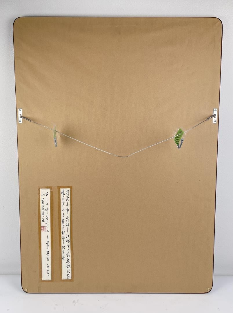 Very nice village scene. Signed on the front and has writing on the back. 38.75" by 27.25" framed.